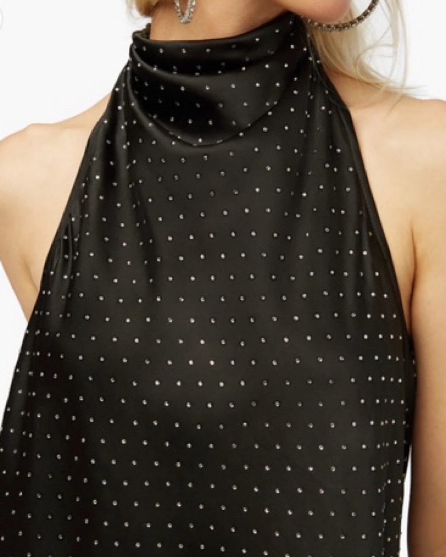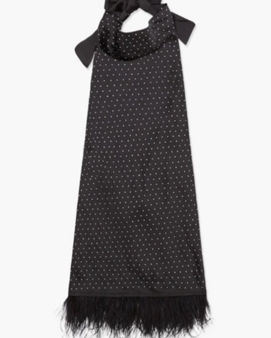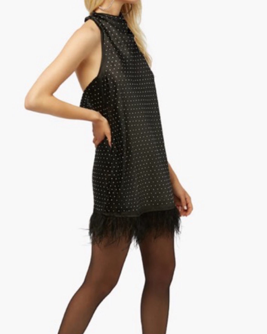 WeWoreWhat black sequin dress with halter tie top and feathered fringe bottom