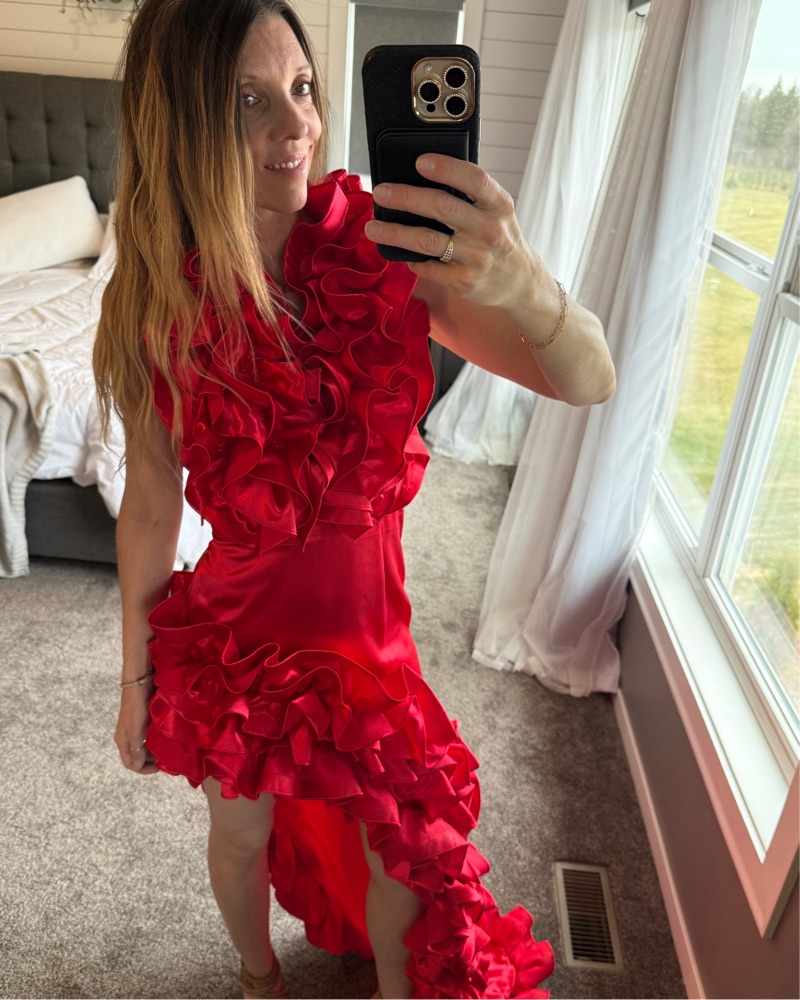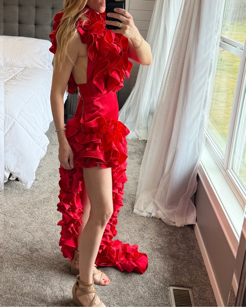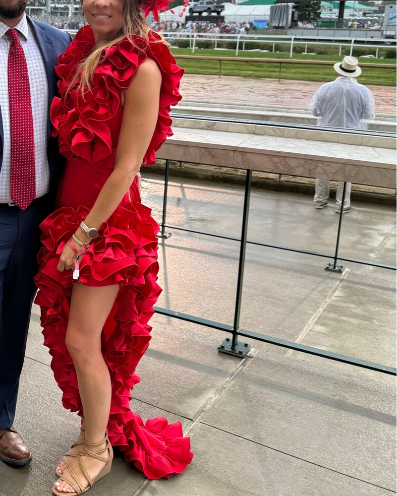 This red head turning gown was worn once to the derby! It’s absolutely stunning. I did stitch the bottom of the ruffles on the chest for a little more coverage. Message me with questions!