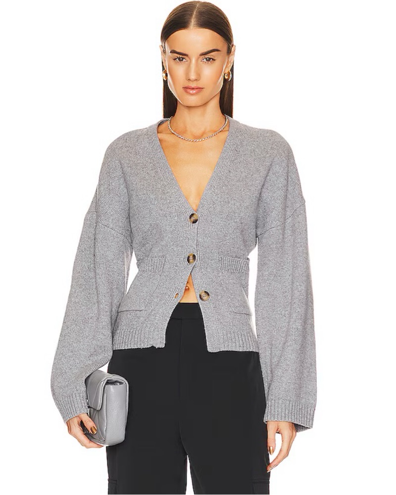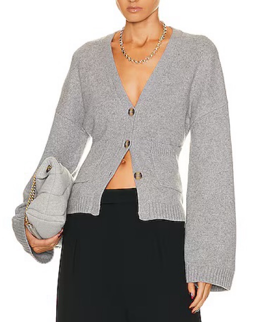 Helsa brand from Revolve. Sanna cardigan in heather grey. Very similar to the Khaite cardigan! Super cute and soft and multiple ways to wear it!