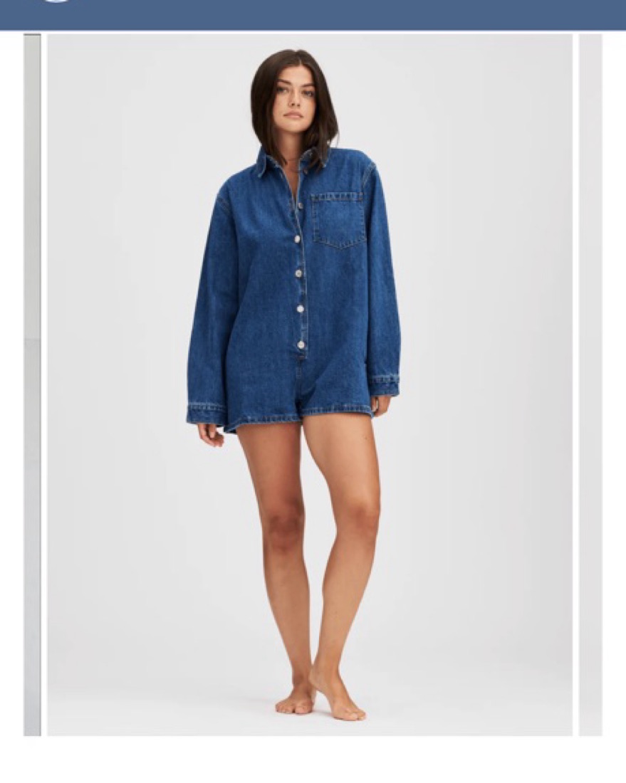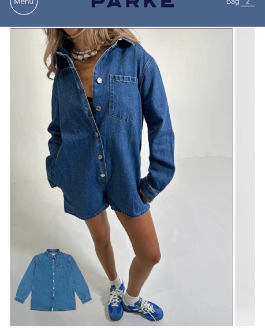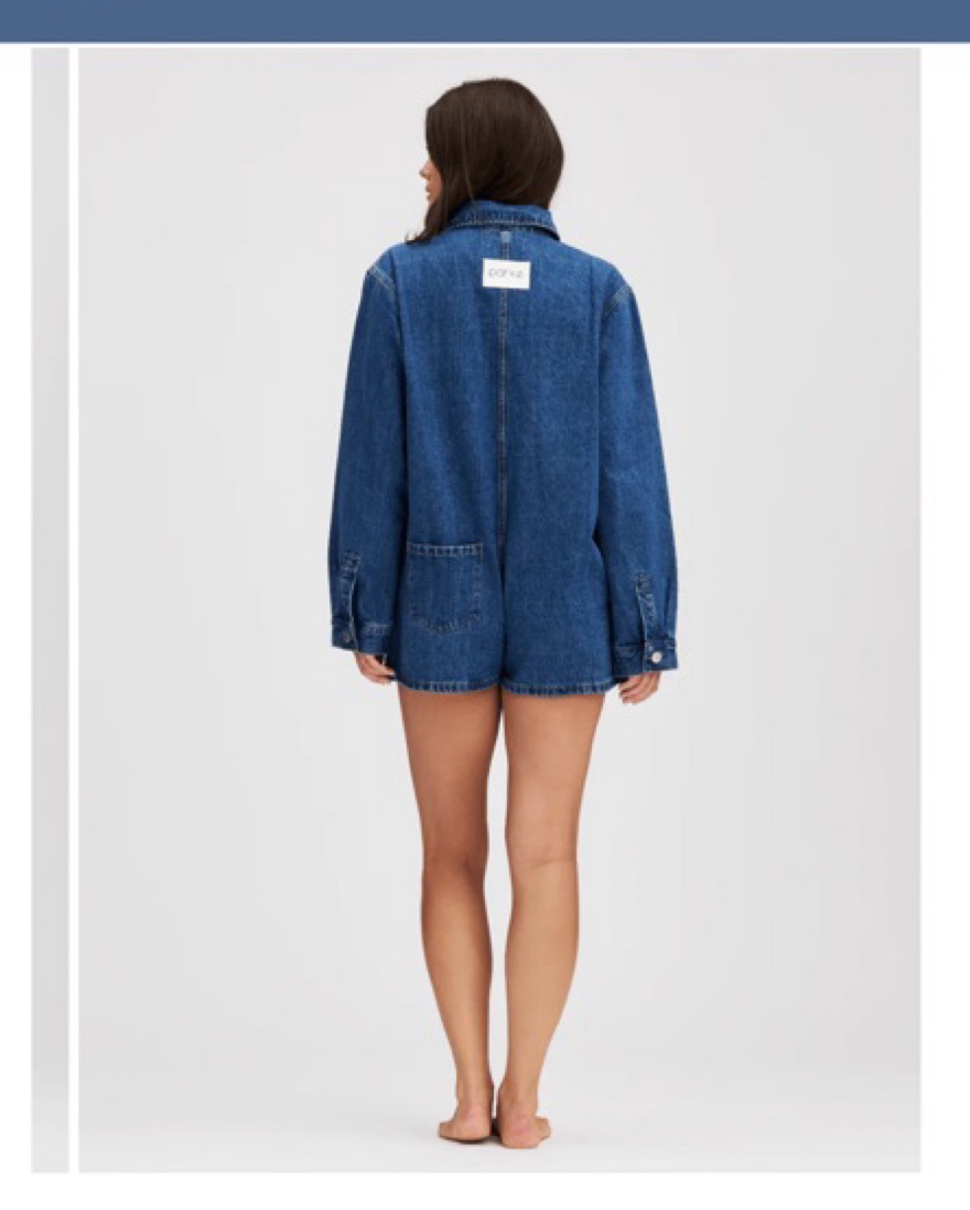 Parke long sleeve denim romper! This is an easy throw on with a button up front, featuring pockets on the chest, sides, and back, along with our Parke leather patch below the collar.