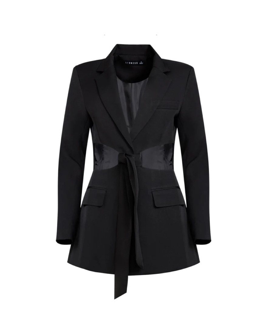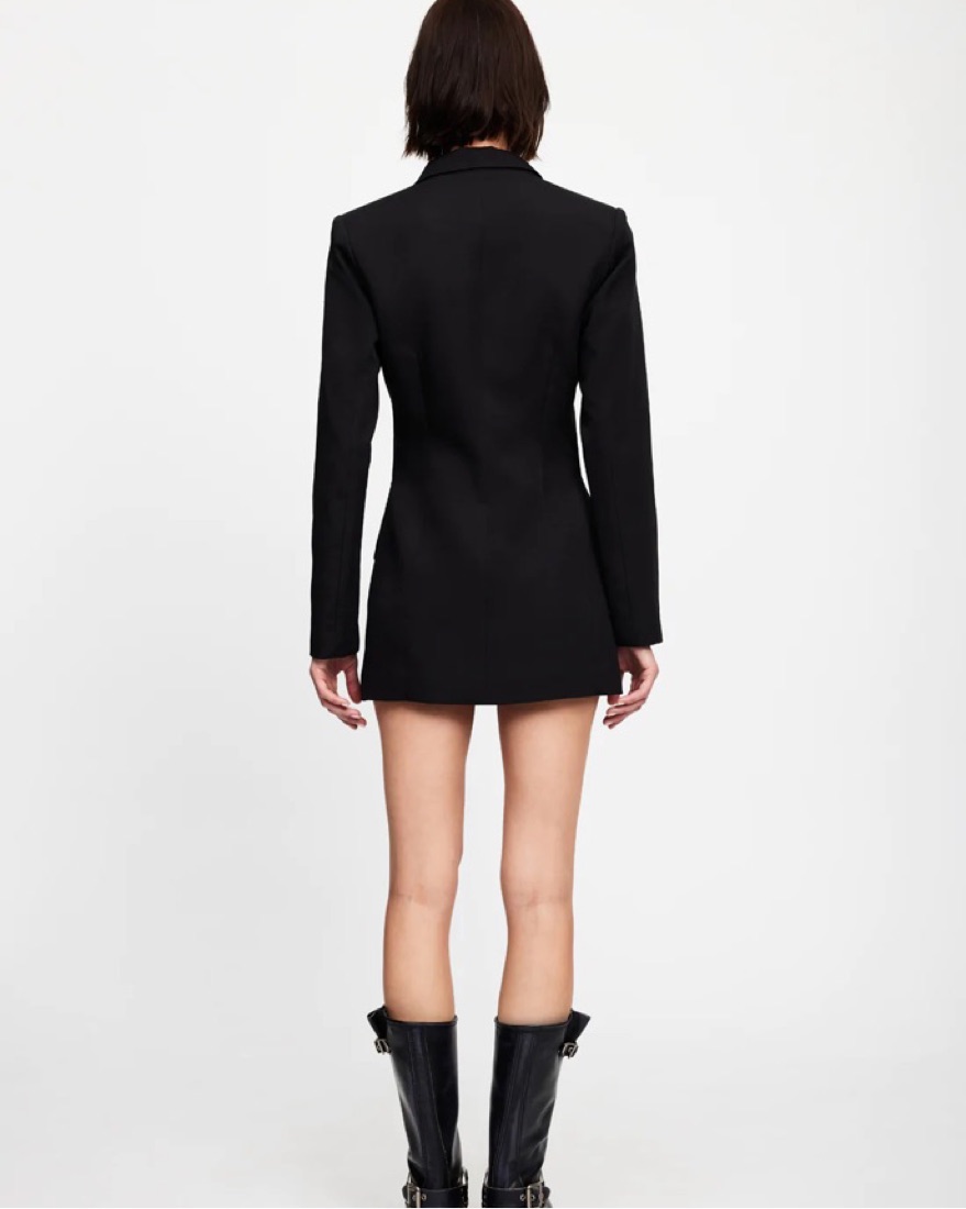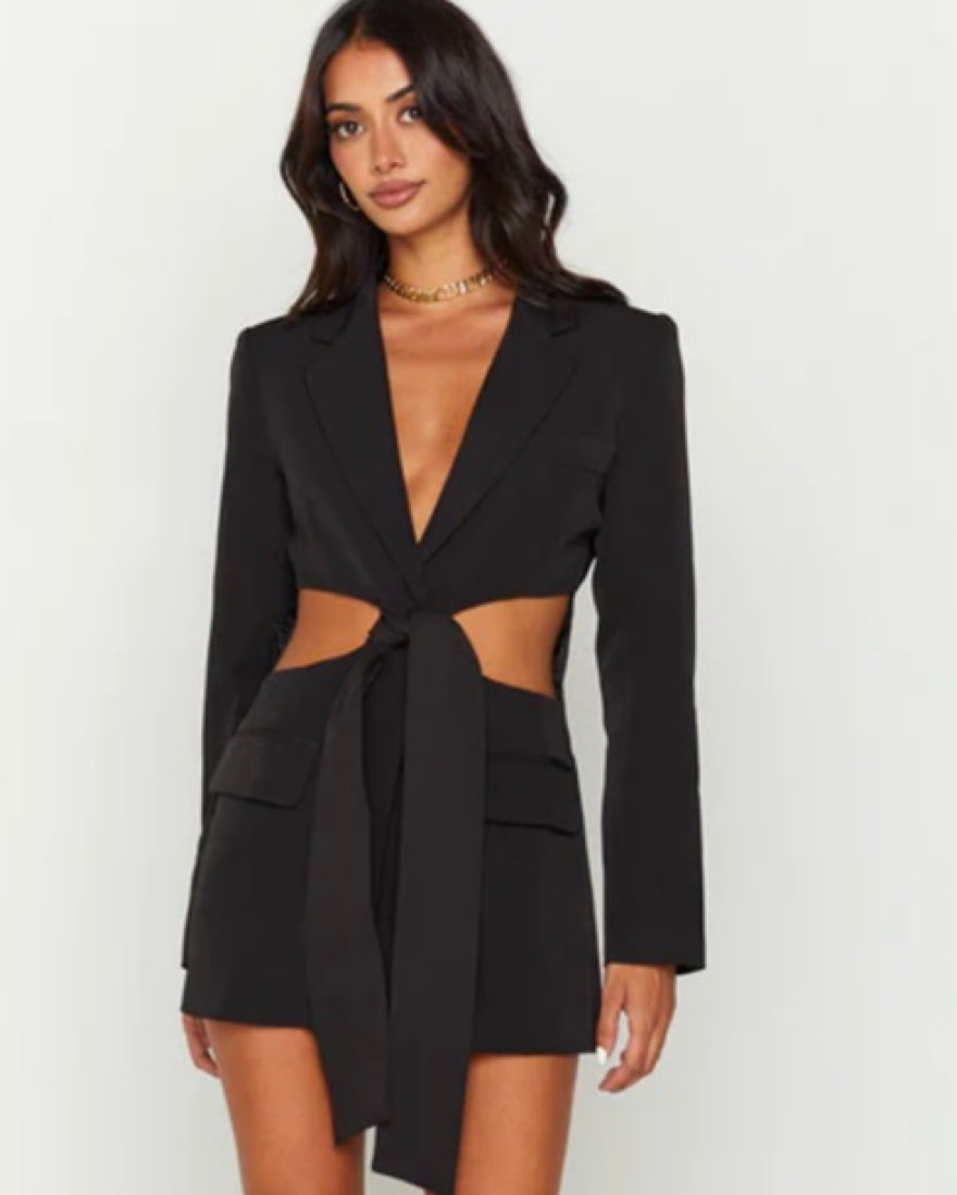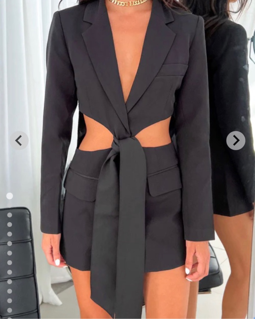 Blazer dress. Plunge neckline. Collar. Functional pockets. Waist cut out. Front tie feature. Bonus points if you style it like Miss Hayley Bieber