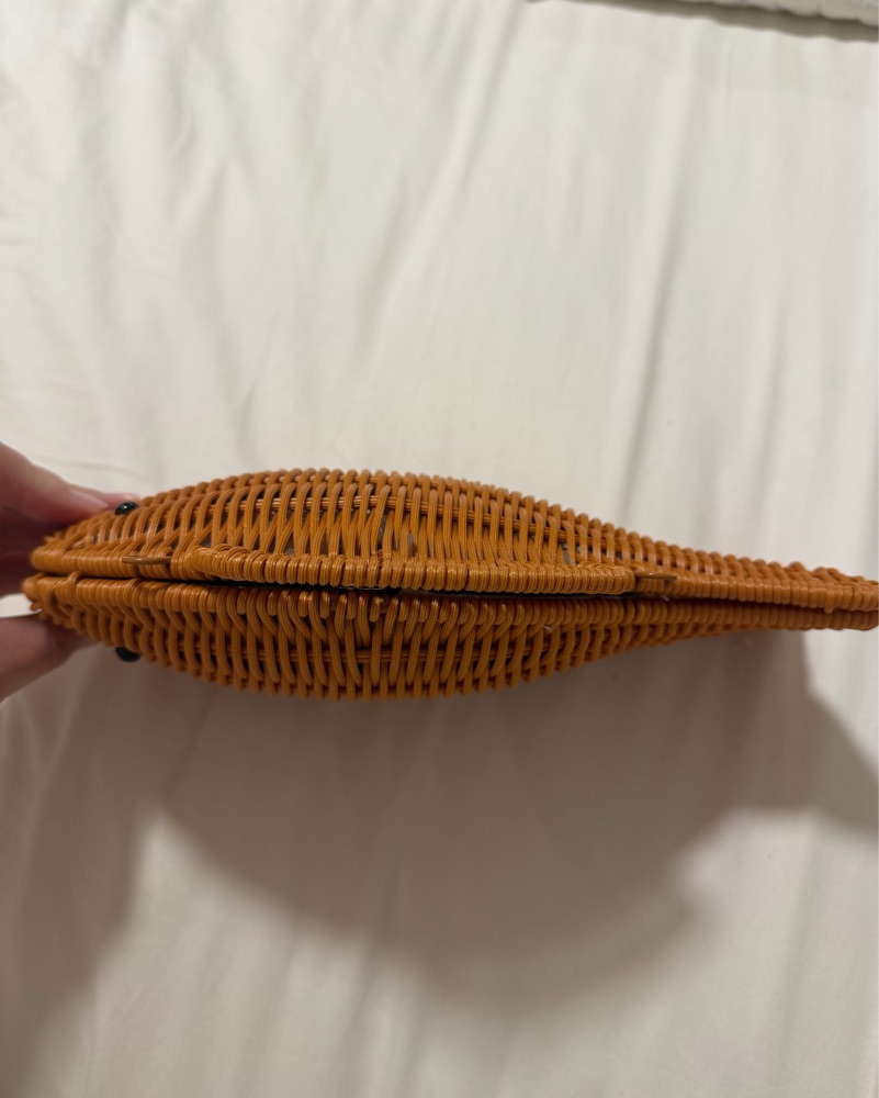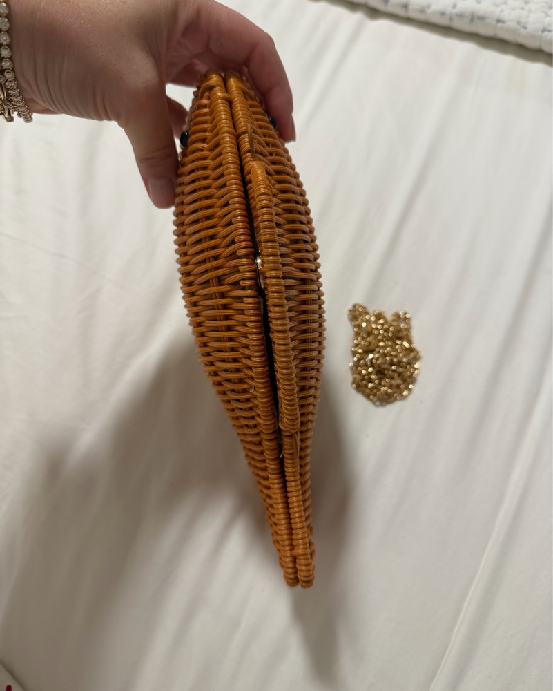 Cute for the summer or a beach vacation. Measures 10 “ long and 7” tall. Can comfortably hold a phone, lip gloss, cards, etc. comes with a metal detachable chain.