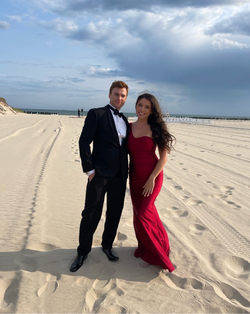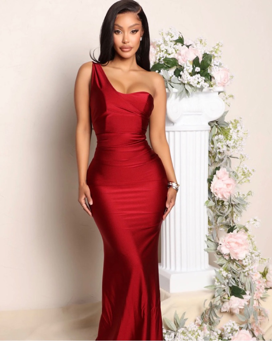 Long deep red colored dress. Satin material. Great for black-tie weddings!