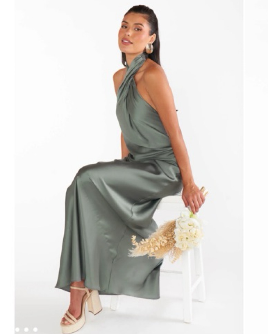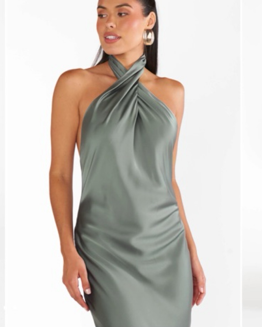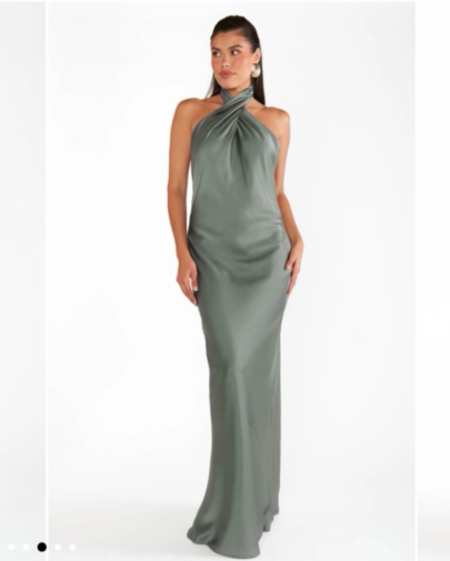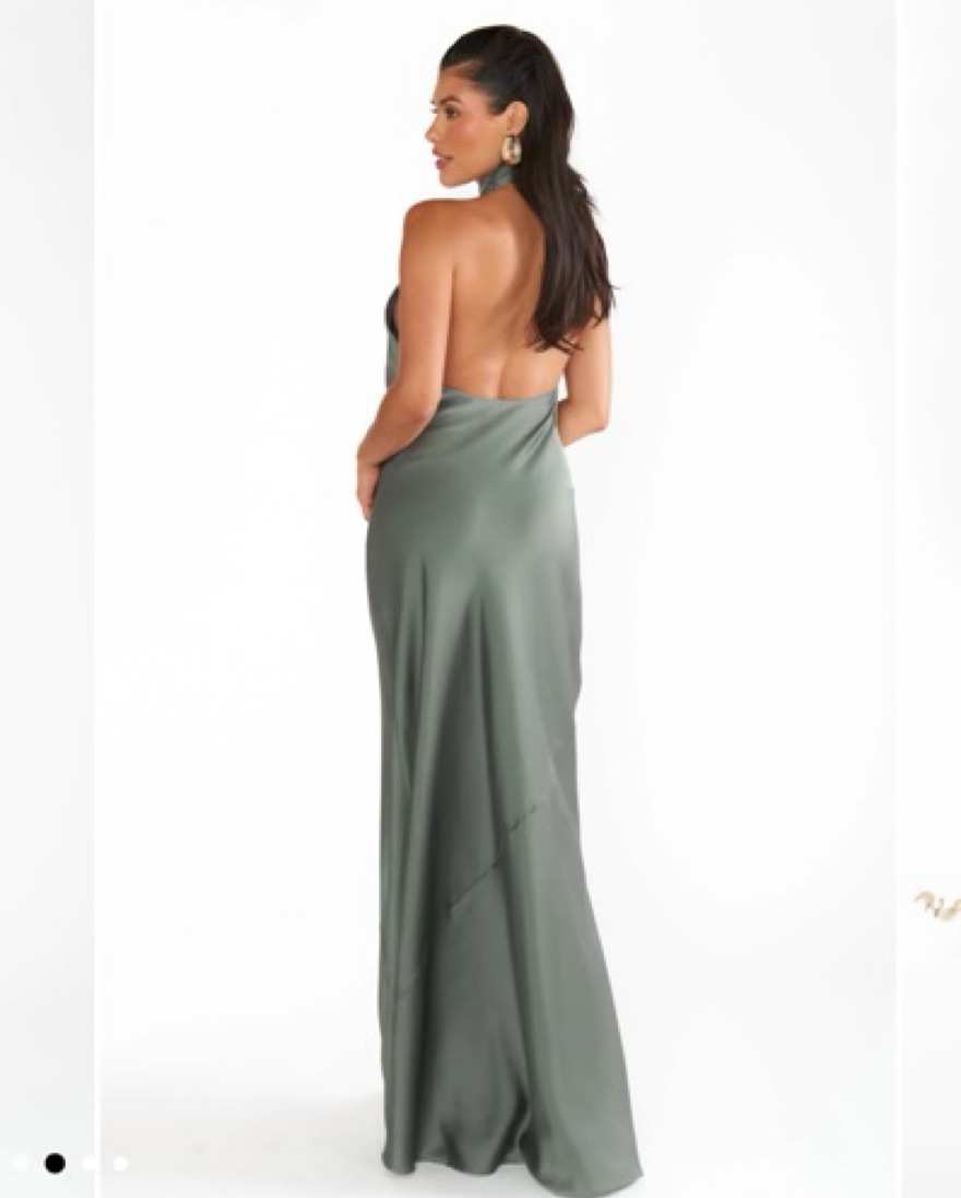 In the color “deep sage luxe satin” and hemmed. I’m 5’4” and wore 3” heels for a wedding. Only worn once! // Column fit, expertly cut for a straight fit with no waist definition. Flattering open back.