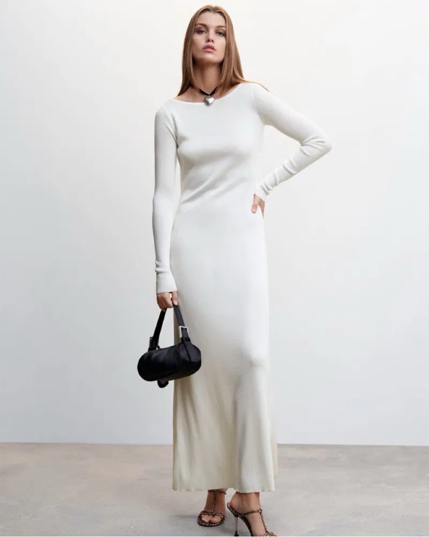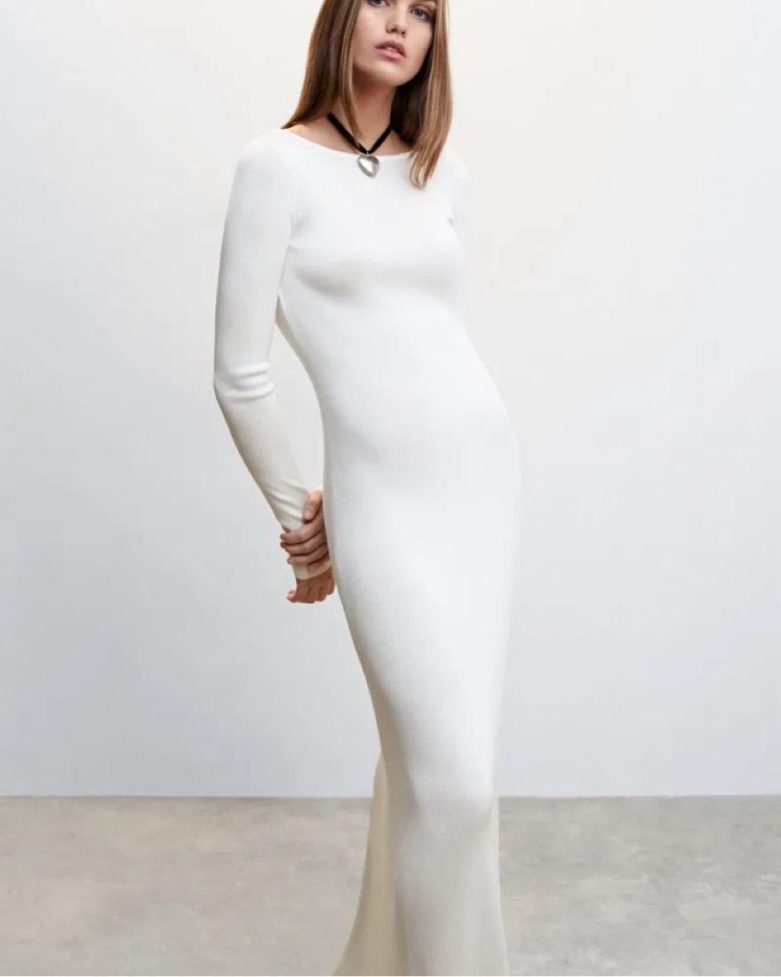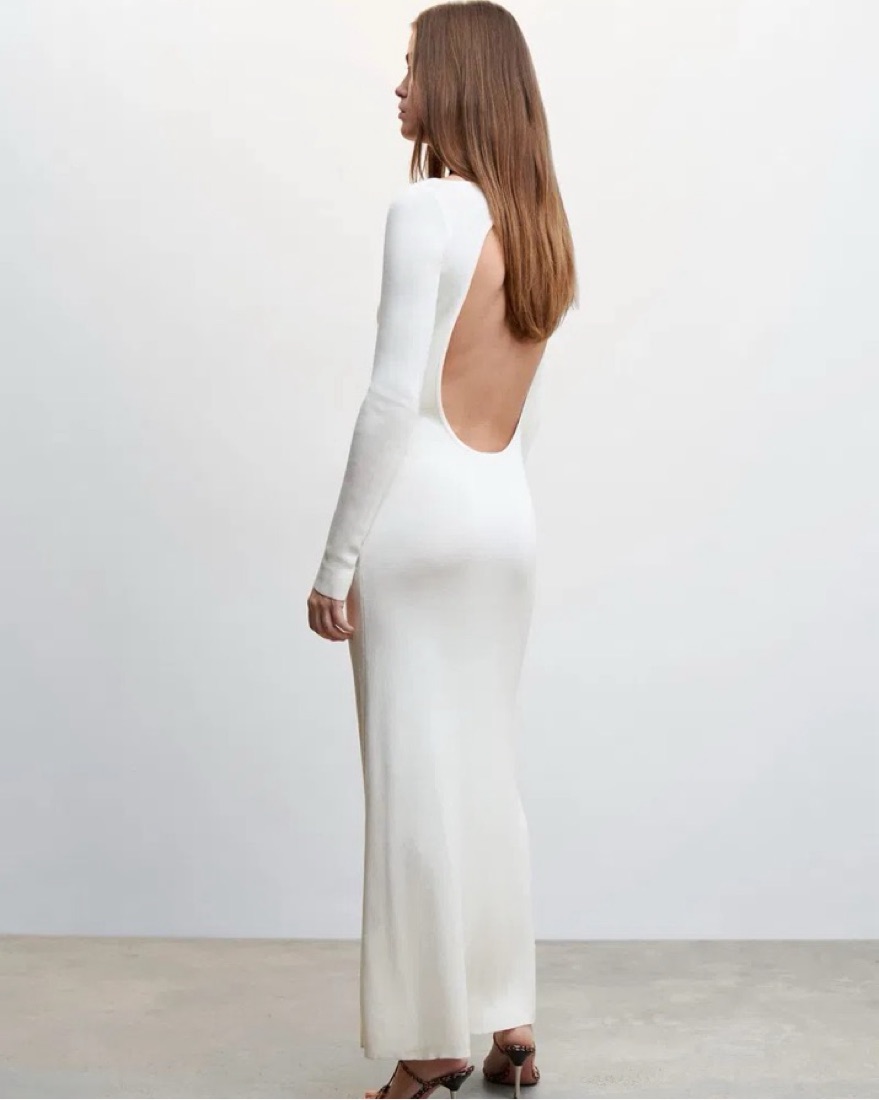 The most elegant & stunning dress from Camille x Mango. Made of fine knit fabric, silk mix with a rounded neck, long sleeve, & open back. Dress is fitted and has a nice silhouette to it!