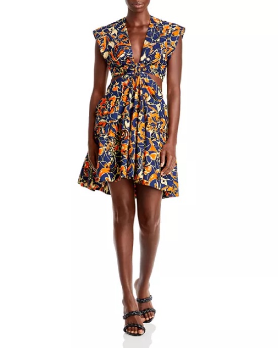 Blue, orange, yellow printed pattern, ruffle and cutout accents, short sleeves with V-neck