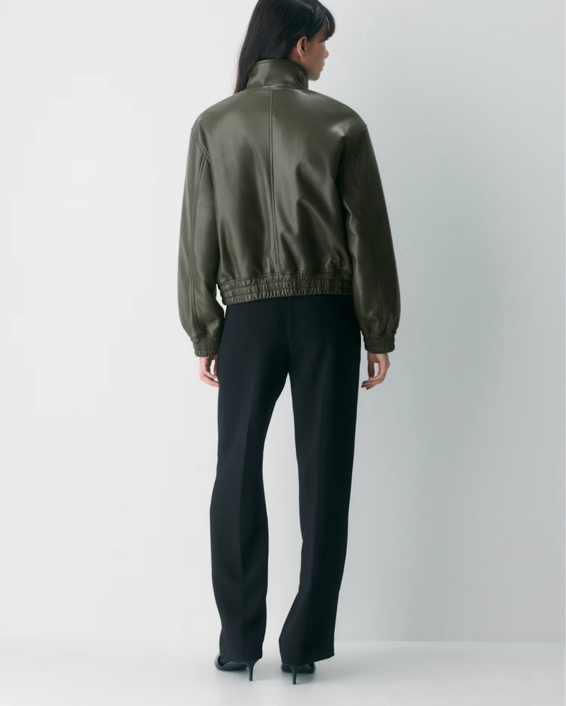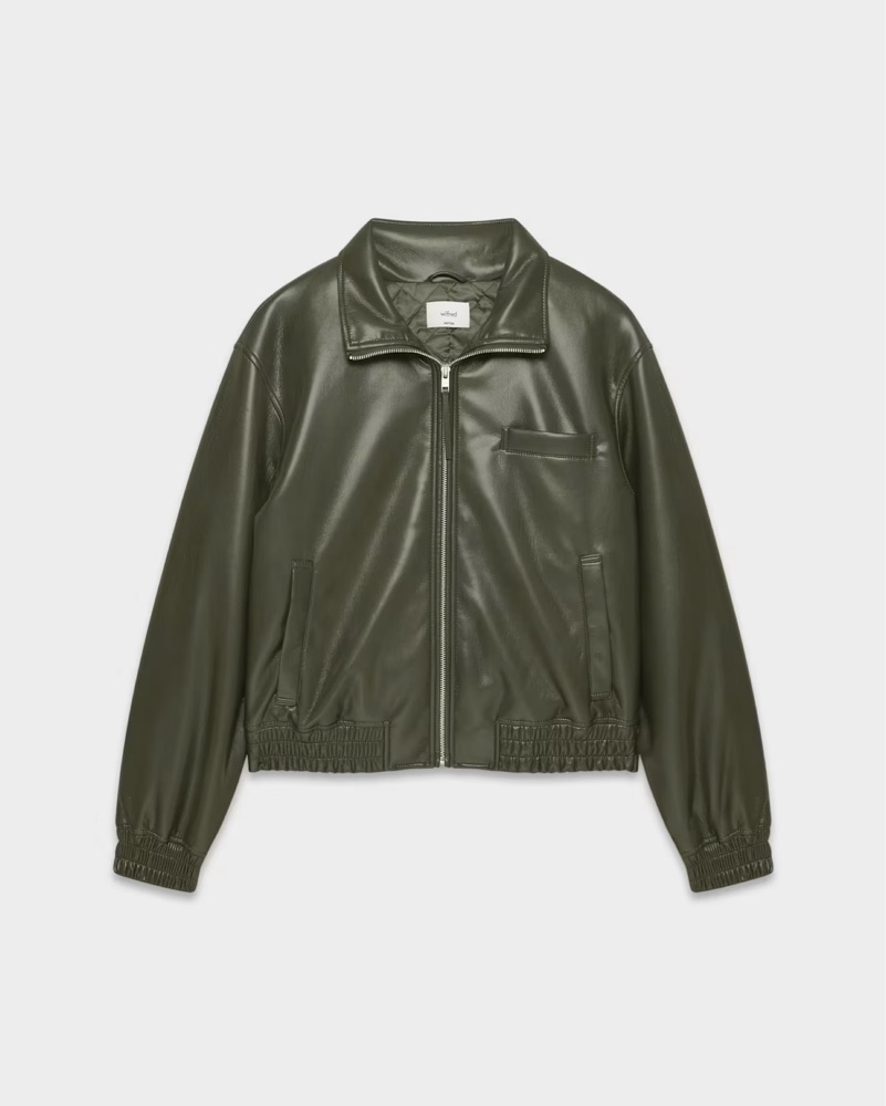 This versatile olive green leather jacket is perfect for elevating any casual or semi-formal look. The bomber-inspired silhouette and ribbed cuffs and hem add a modern, sporty touch.