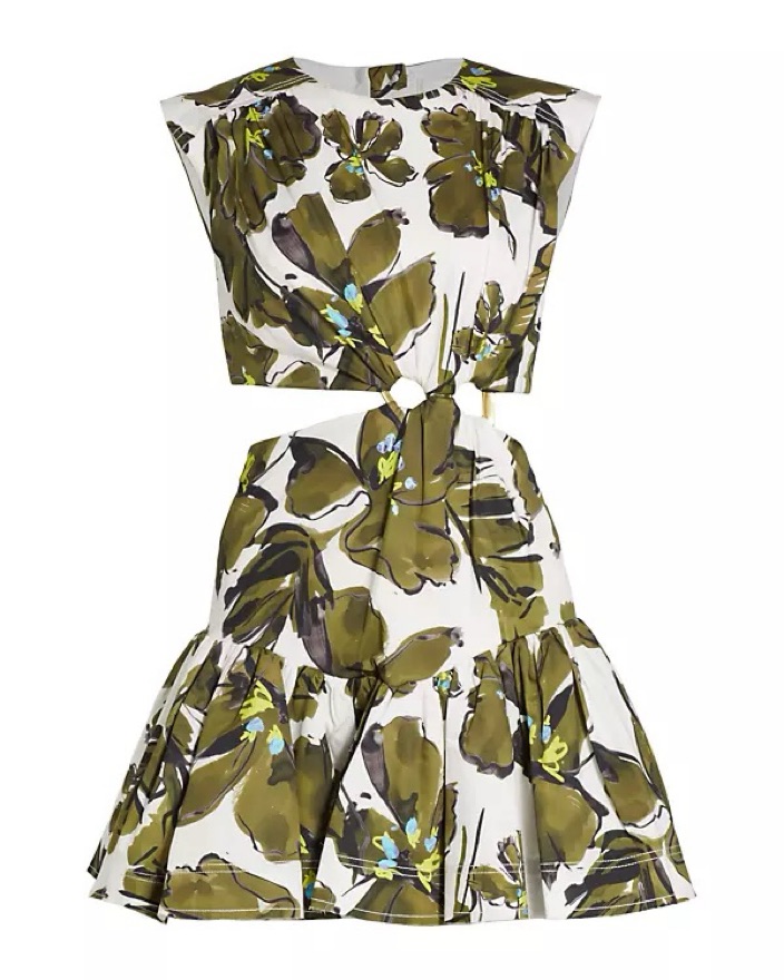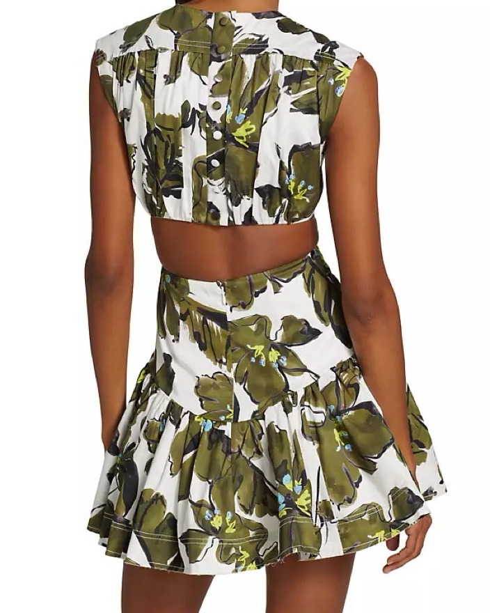 Perfect condition. Worn once. Aje Cut-Out Mini Dress in Horizon Olive Floral colorway. Crew neck with cap sleeves. Top back snap closure with external aesthetic buttons, bottom back zipper closure.