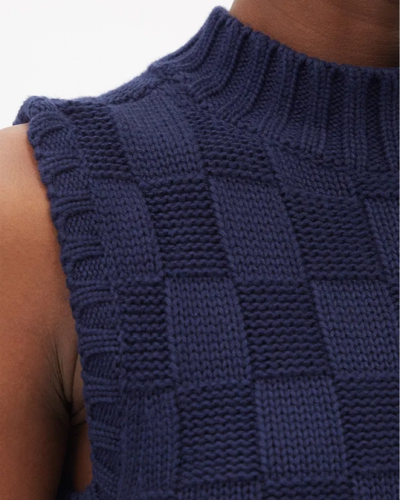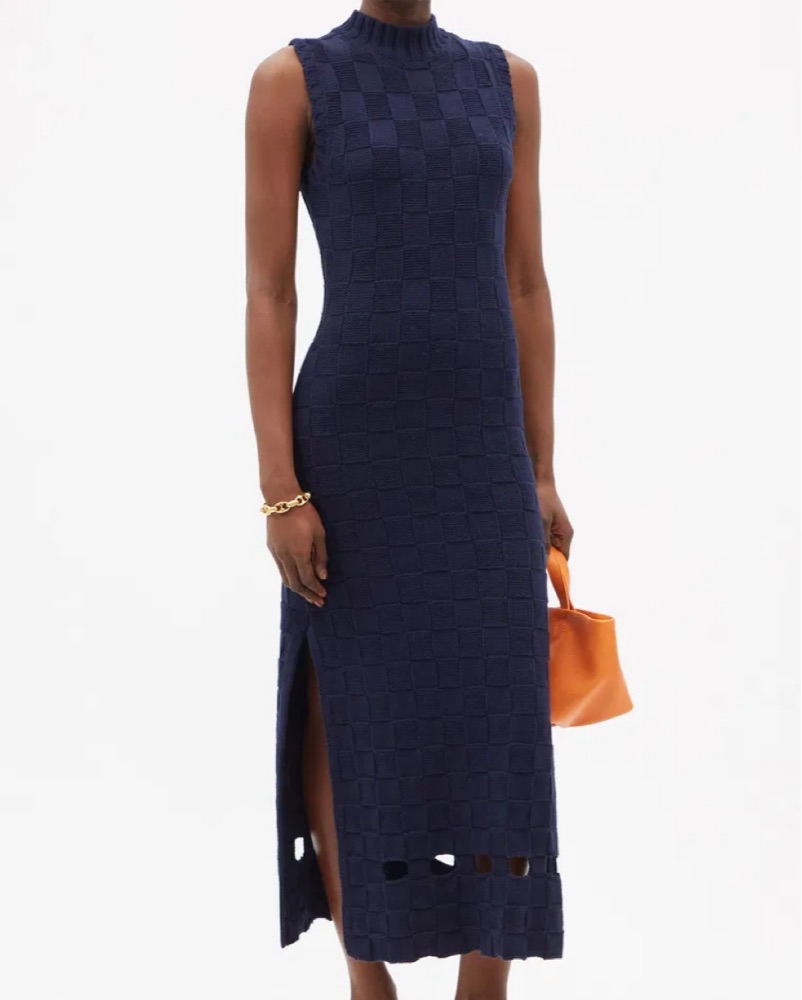 This sleek navy blue knit midi dress is perfect for any formal or semi-formal occasion. The figure-flattering silhouette and high neckline create a sophisticated look.