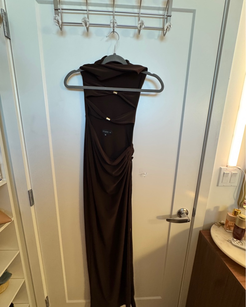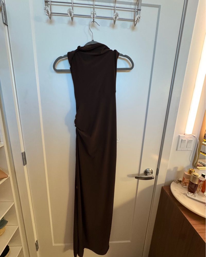 This stunning black maxi dress is perfect for a formal event or special occasion. The draped design and sleek silhouette create a sophisticated and elegant look.