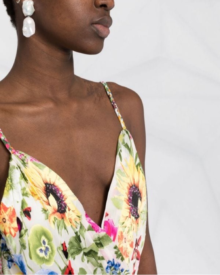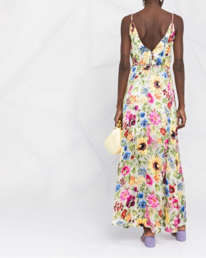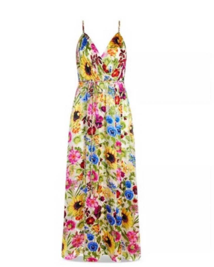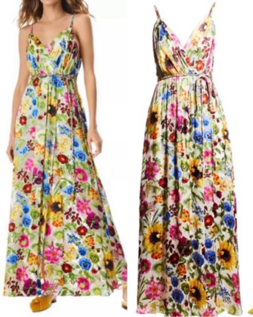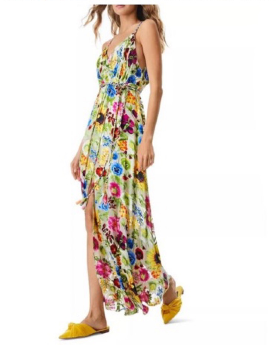 Never worn. V-Neck/faux wrap Sleeveless A-line silhouette Self-tie belt Full length Back zipper Viscose/silk Dry clean only