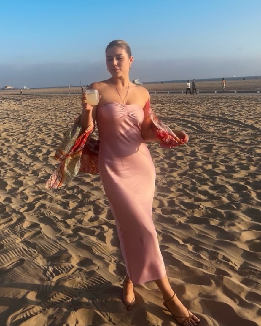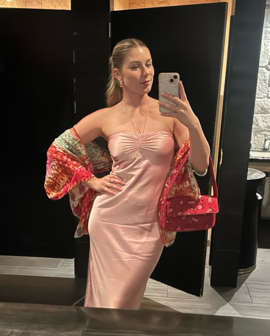 Reformation valora baby pink satin halter tie slip midi dress! I am 5’8, 34DD with 25/26 waist who usuallt wears anywhere between 0-4 & XS-M depending on the piece and brand.