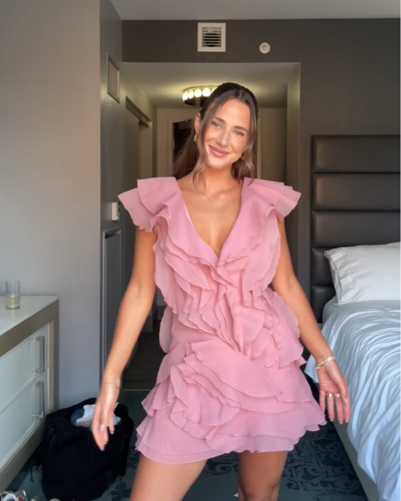This enchanting Rosanne Mini Dress is perfect for a romantic date night or chic cocktail party. The ruffled organza fabric creates a delightful, flower-like silhouette that is sure to turn heads.