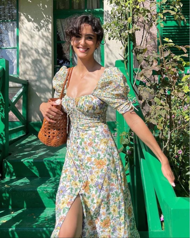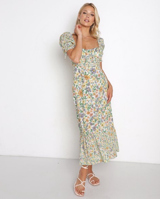For Love and Lemons Riley midi dress in a yellow, green, purple, orange floral print