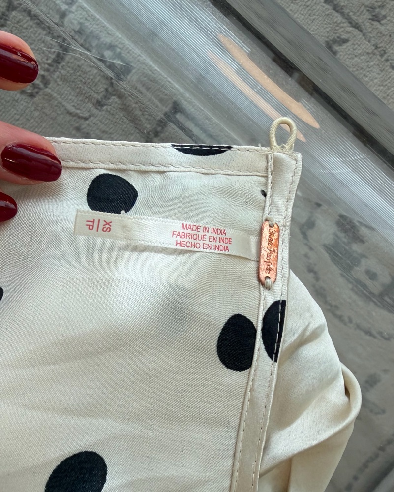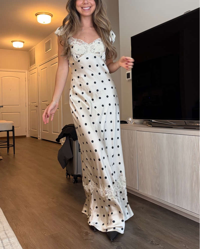 Perfect in polka dot, this stunning maxi dress is featured in a classic, A-line silhouette with butterfly lace-adorned neckline and slightly puffed capped sleeves for an added timeless touch.