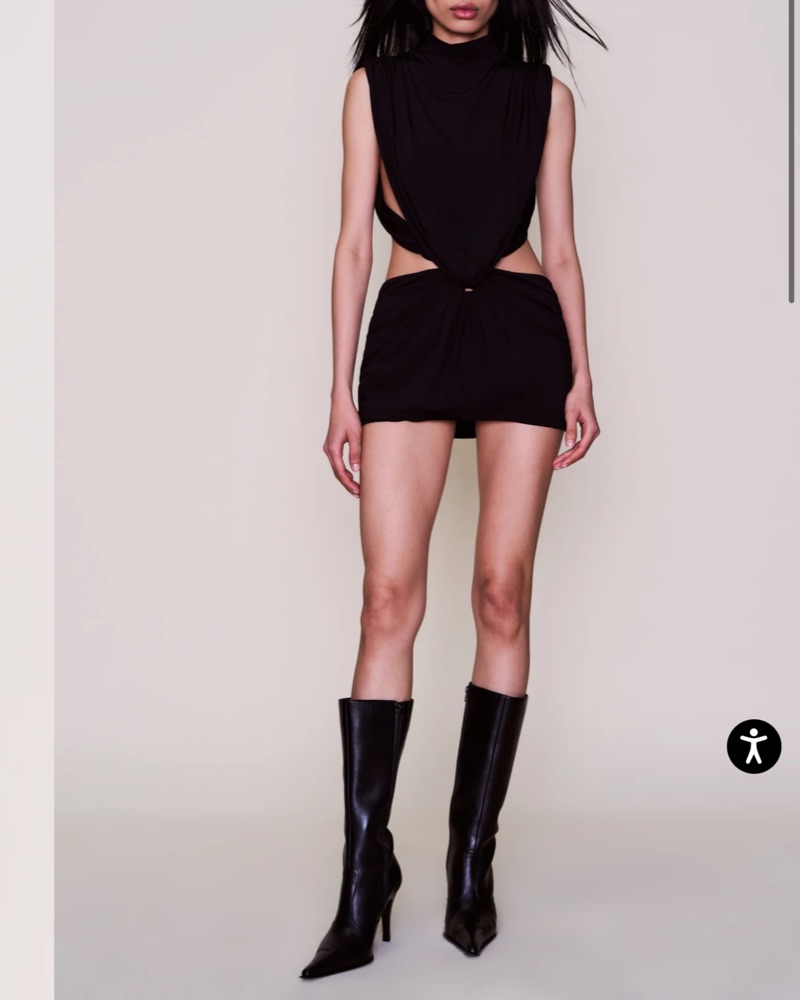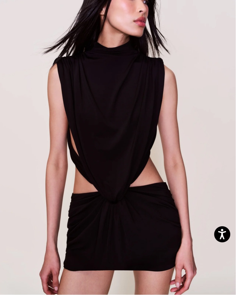 The Shyla Mini Dress features a fluid, high-neck silhouette with dramatic open sides and a twisted front detail that meets at the waist. The skirt drapes low on the hips, balanced by a barely-there back with adjustable ties. Fully lined. Pull-on style.