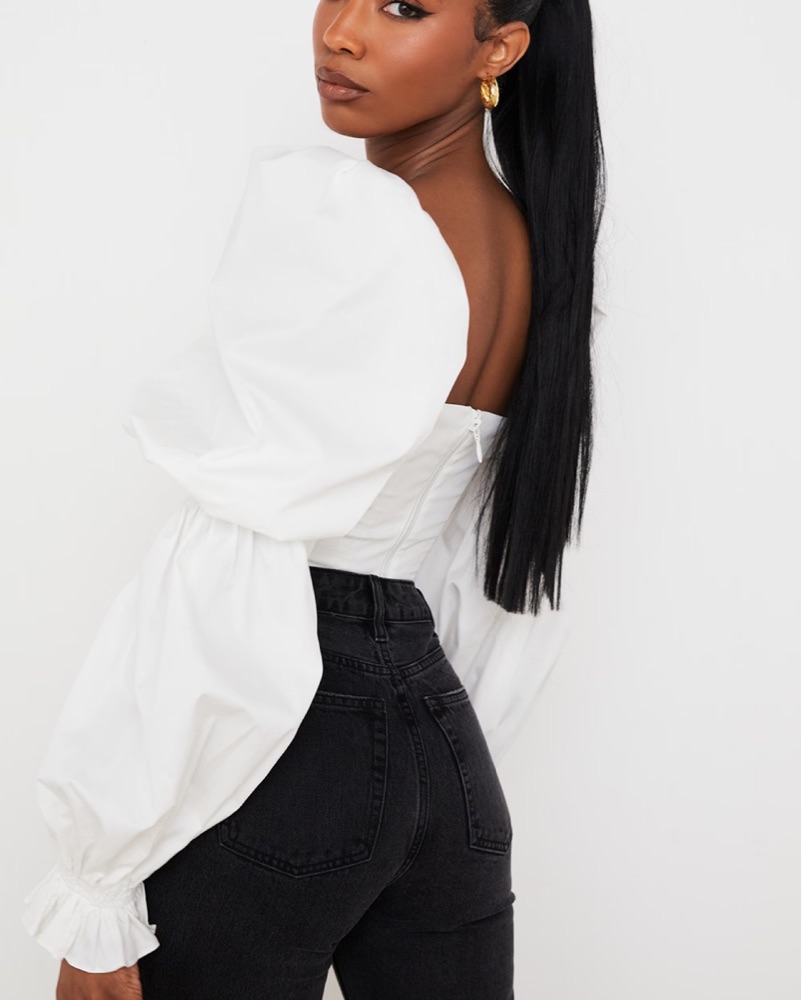 This chic and stylish white crop top with puff sleeves is perfect for a night out or a special event. The dramatic sleeves and fitted silhouette create a stunning look.