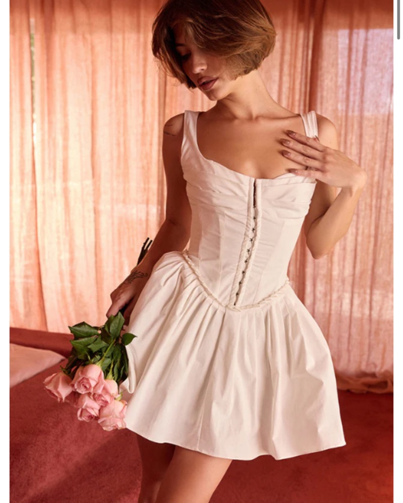 corseted bodice snatches the waist. The skirt is layered with the tulle for the perfect shape. zips up the back. size M, would fit 4/6 best
