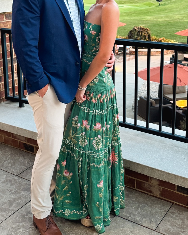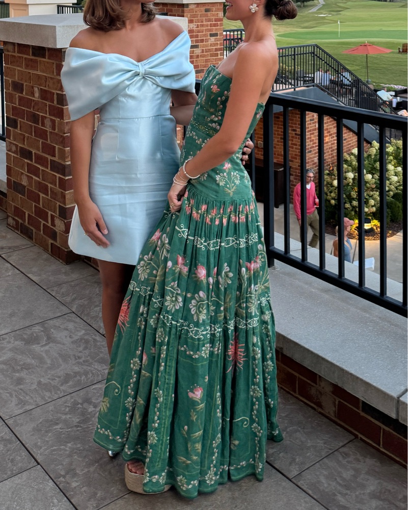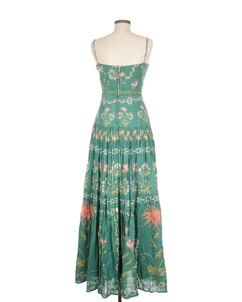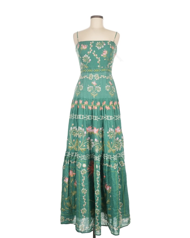 This Agua by Agua Bendita dress features a vibrant floral print on a green background, radiating tropical elegance. Ideal for summer gatherings, it pairs well with simple sandals and a woven clutch.