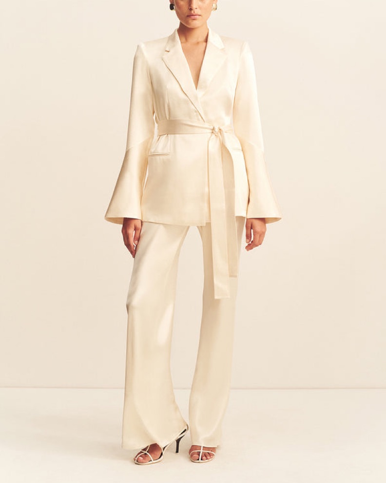 Soooo chic - wore for our rehearsal dinner and got so many compliments! Jacket, Pants, belt. ——Flared sleeve belted blazer in a cream in a LENZING™ ECOVERO with a luxurious satin finish. —- High waisted bias cut pant in cream in a LENZING ECOVERO with a luxurious satin finish.