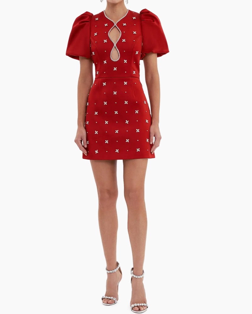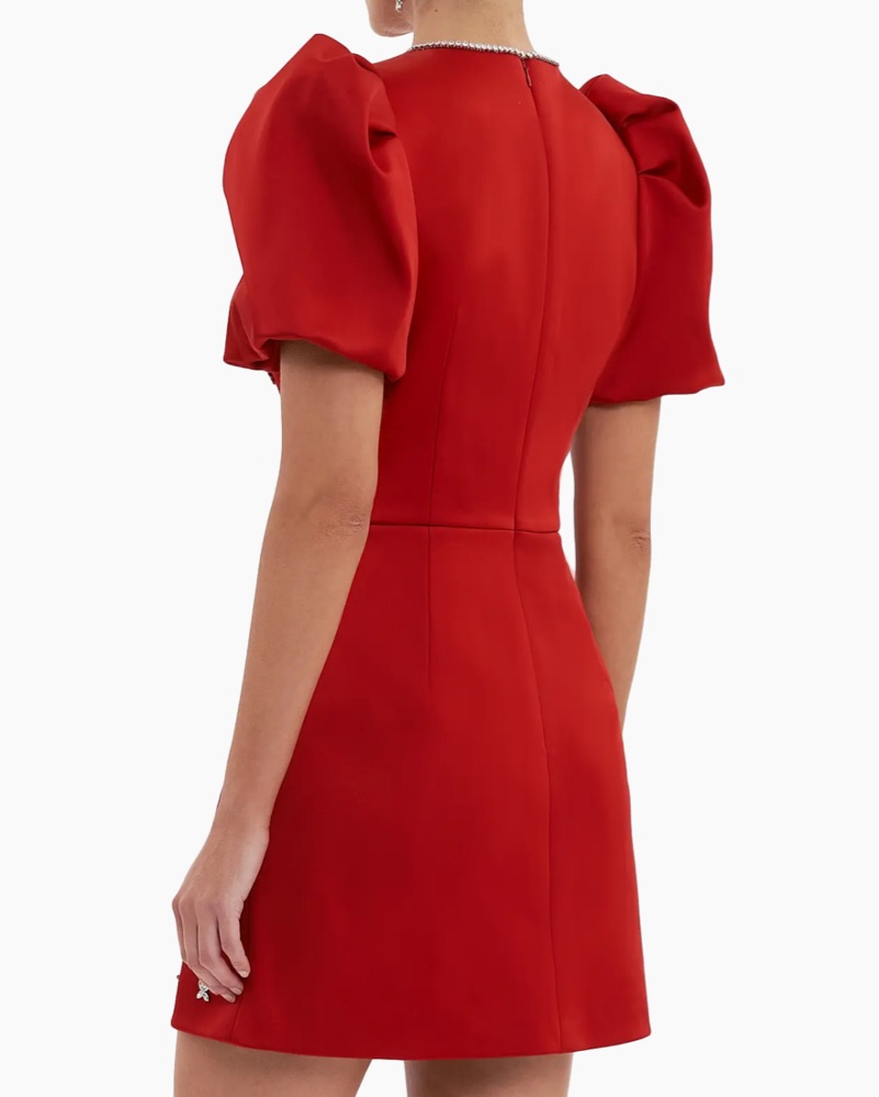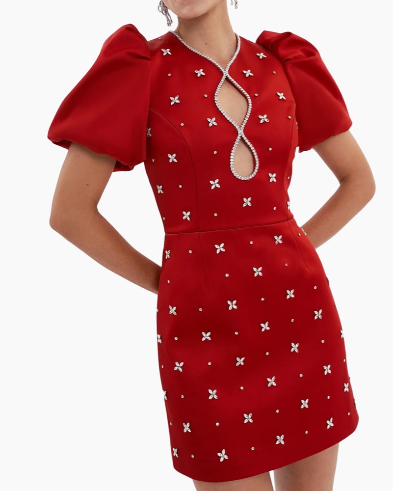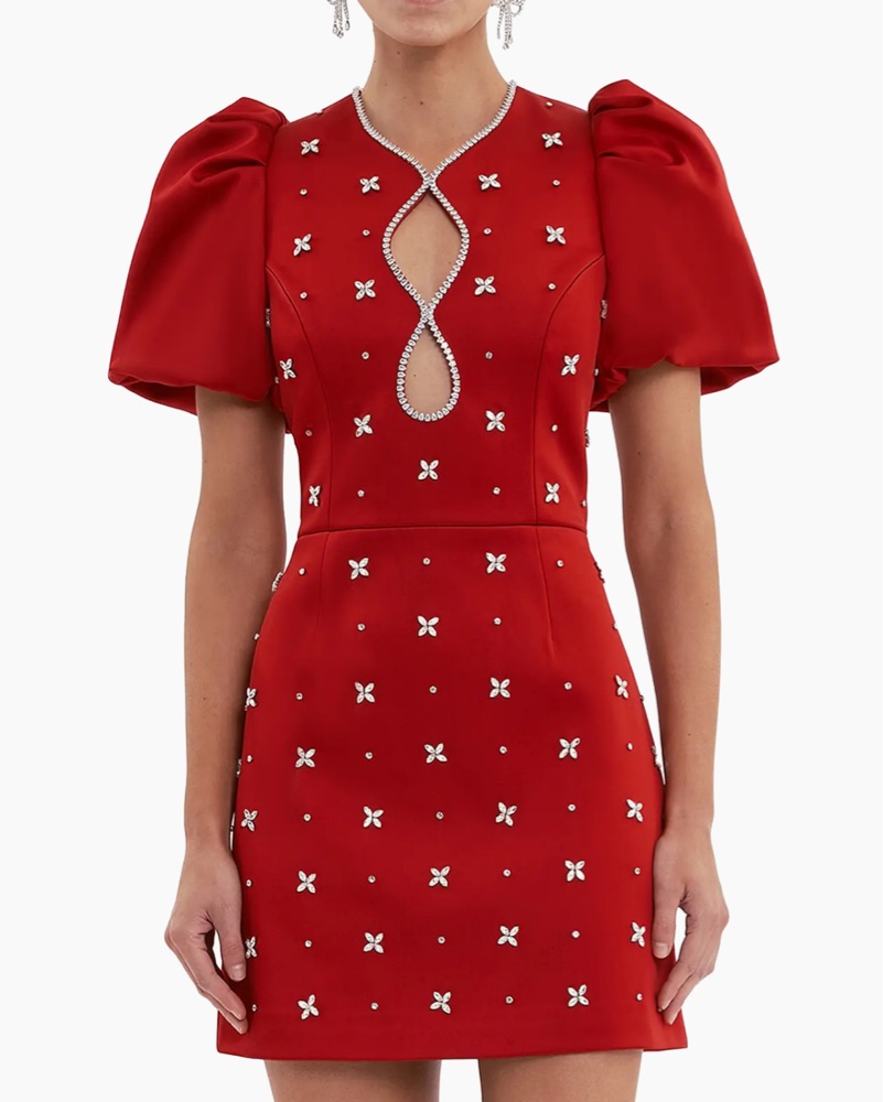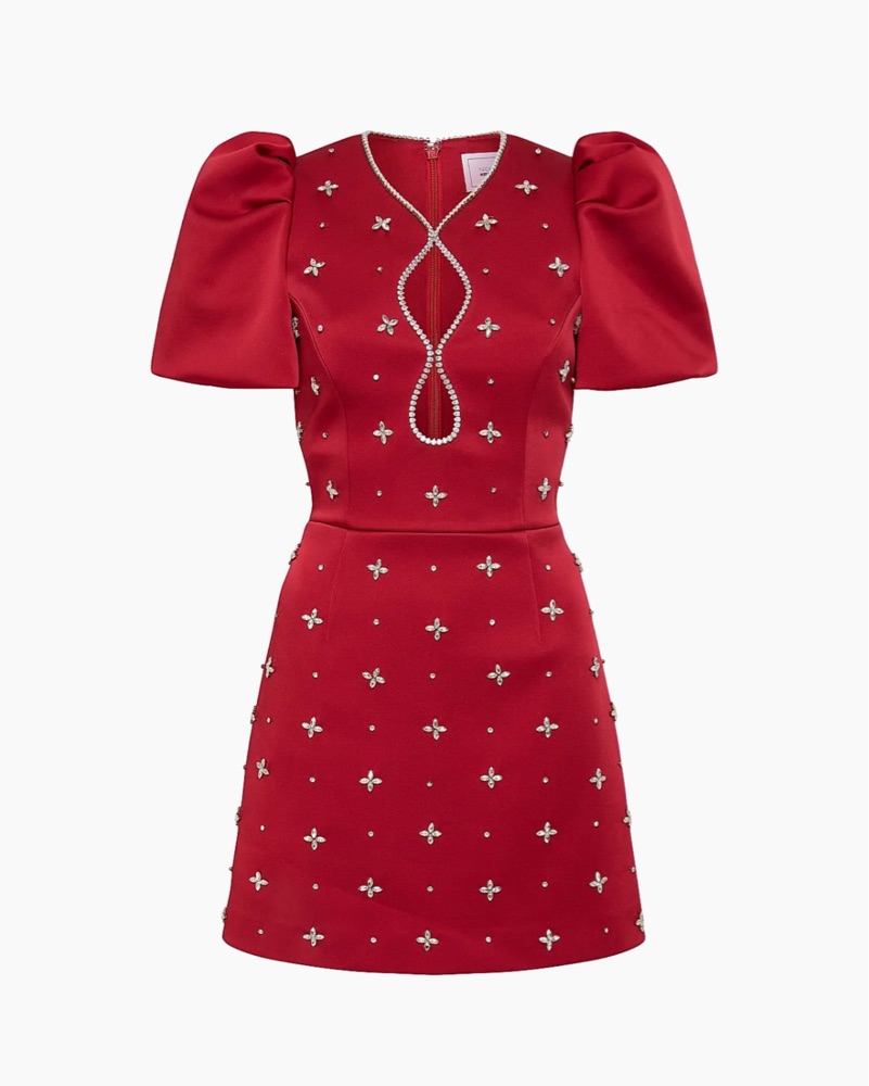 Rebecca Vallance Nicky Hilton x Rebecca Vallance Carmella Embellished Puff-Sleeve Mini dress red with rhinestone gems silver