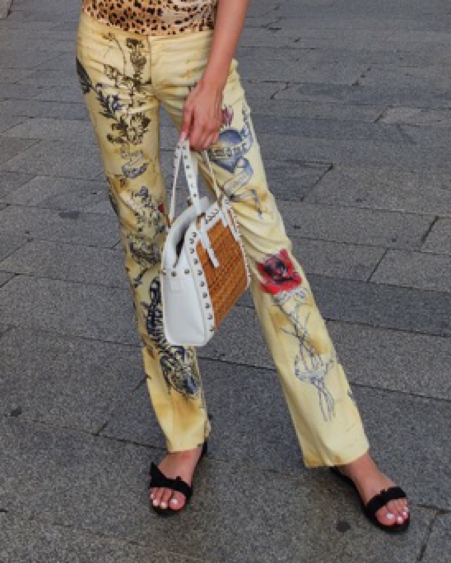 Vintage Spring ‘03 Roberto Cavalli “Tiger Amour Tattoo” jeans. Similar to the pair worn by Kendall Jenner but this pair is lowrise.