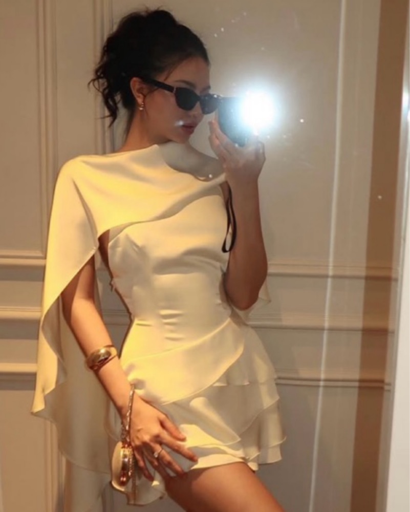 This chic and sophisticated white mini dress features a flattering one-shoulder design, cascading ruffles, and a sexy open back, perfect for a night out or special occasion.
