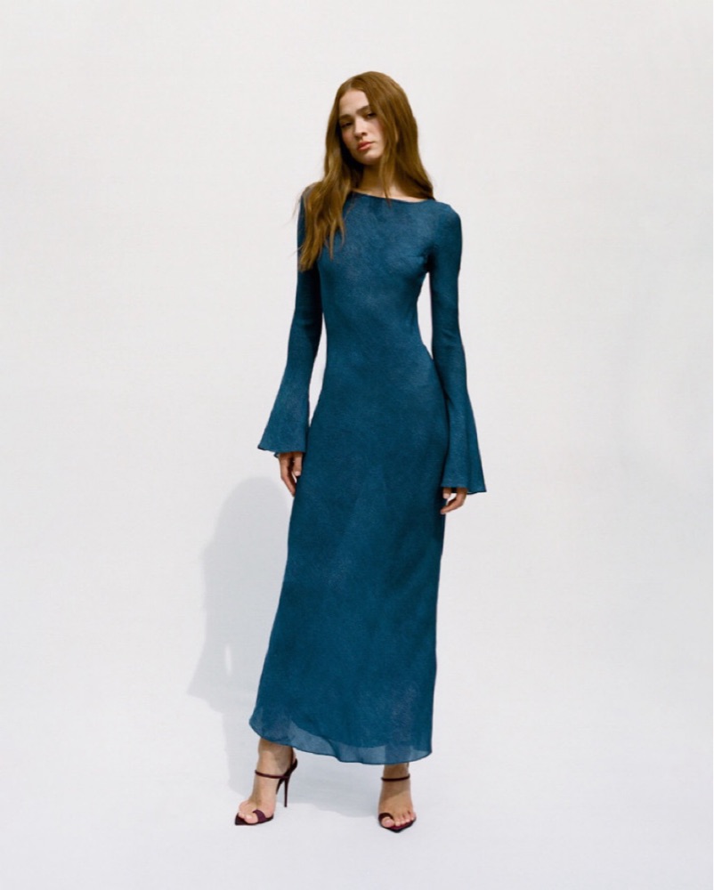 long sleeve silk blue dress in color “denim”. great for layering in fall/winter. perfect for weddings, date night, or any special occasion