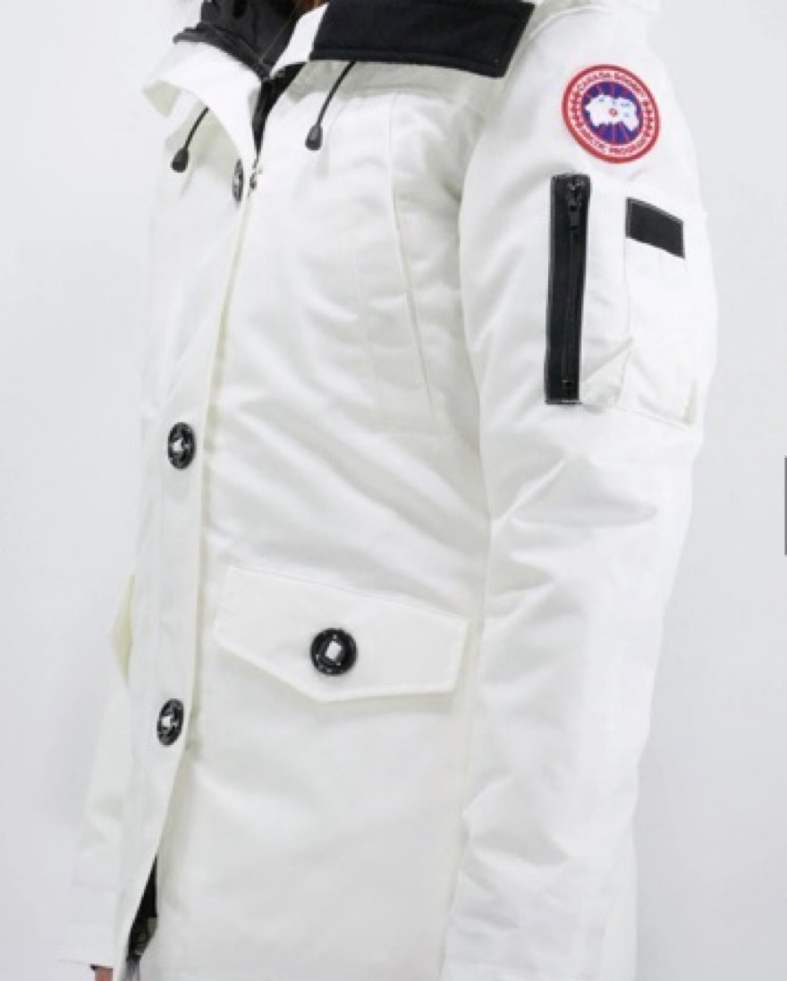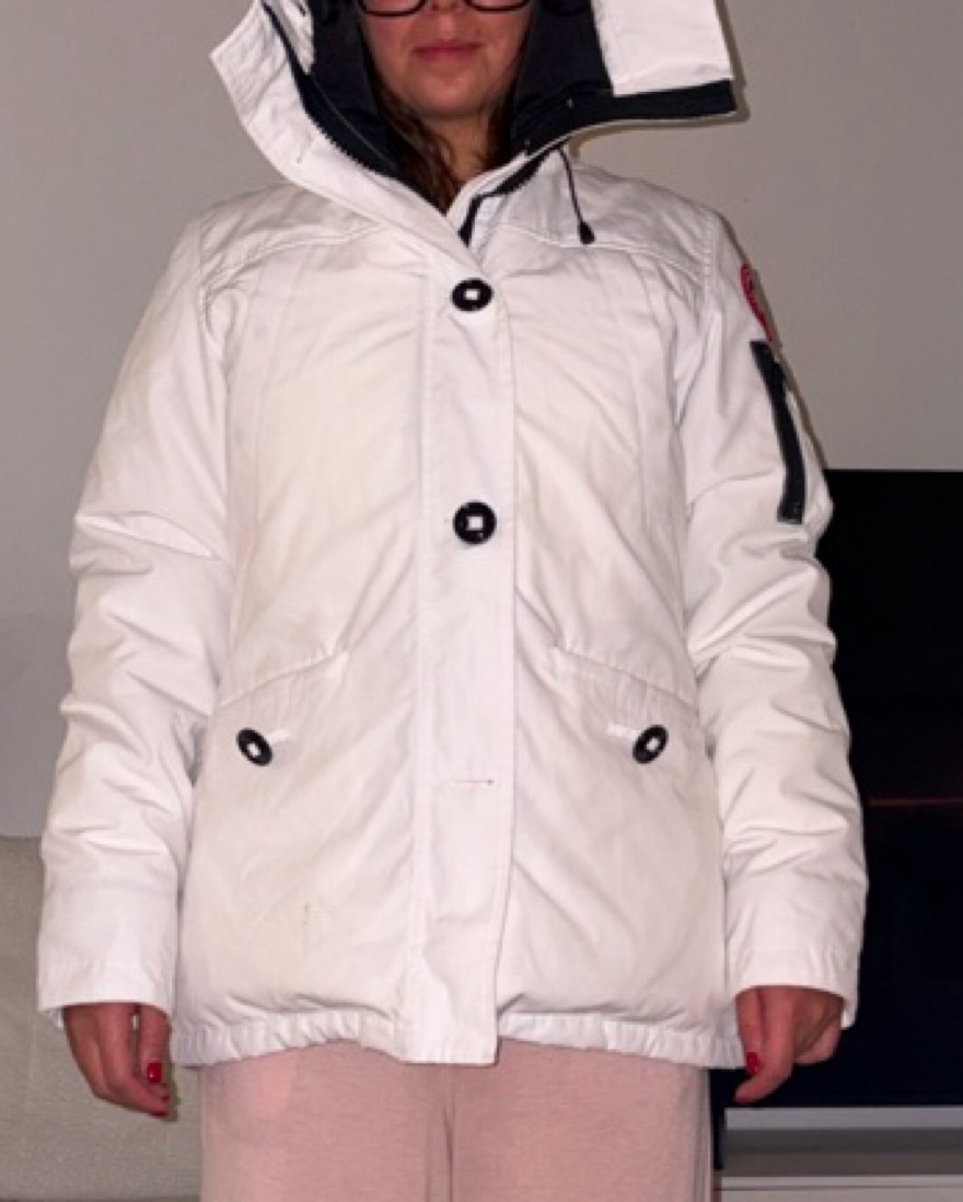 This is a canada goose montebello parka which used to be my go to for ski trips. It definitely keeps you warm in the snow! The arm zipper is perfect for a ski pass! It fits well on most heights and looks great with white and colored ski pants! SIZE LARGE