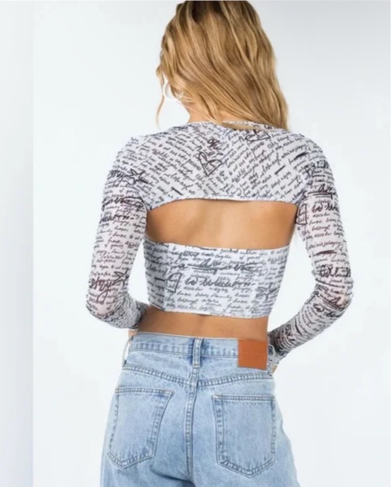 This chic crop top features a bold, stylized graphic print 🖤