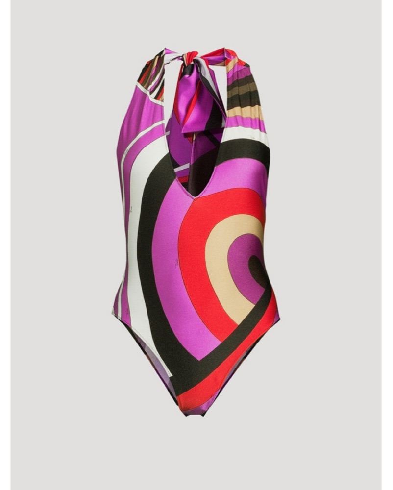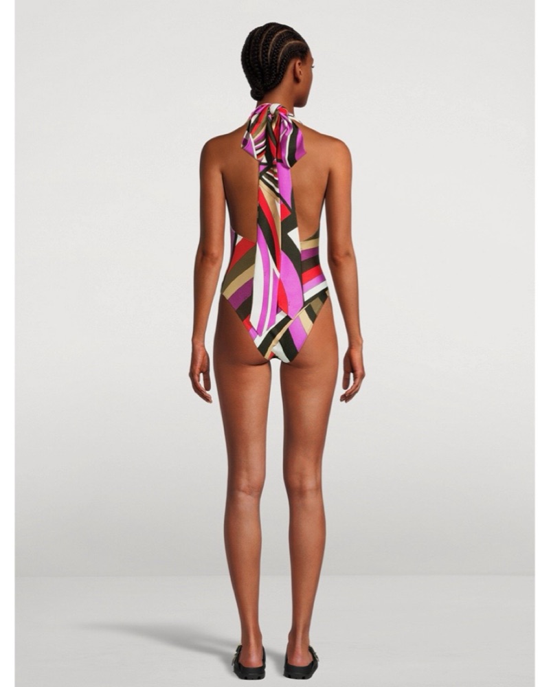 The sun-soaked Iride print and vintage-inspired design add flair to this swimsuit. It's cut to a halterneck silhouette with a plunging V-neck and open back. Size XS, best for a US 0/2.