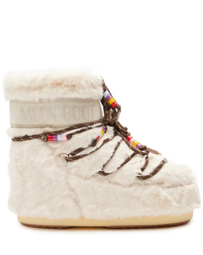 Moon Boot Icon Low Faux Fur Boot in Cream. Absolutely iconic snow boots with brown lace-up strings + colorful beading. Size 42/44, but could comfortably fit sizes ~9-11 (or smaller depending on how much you’re bundling up!). Also have 3 other pairs of Moon Boots available to rent / purchase, NWT!