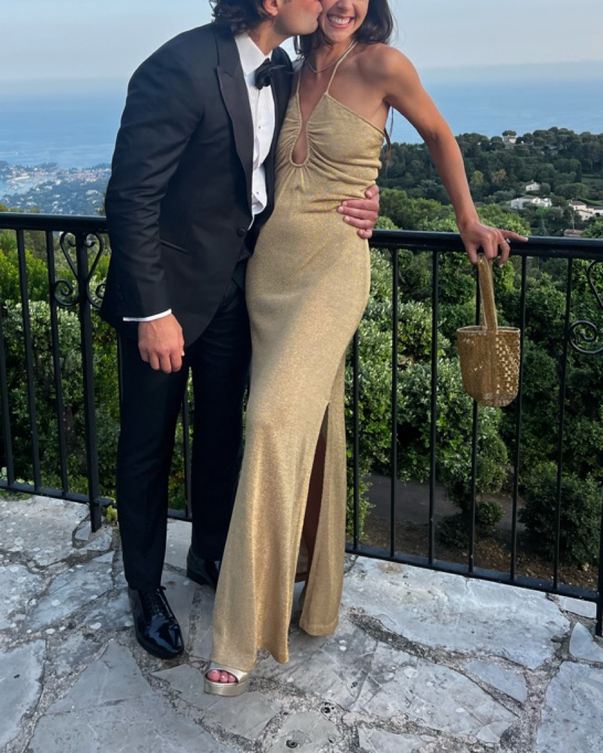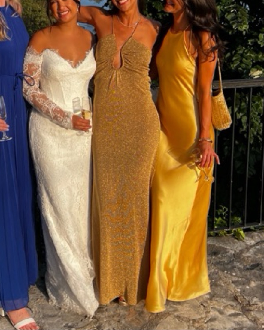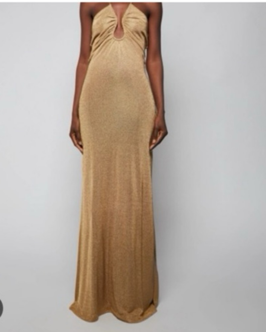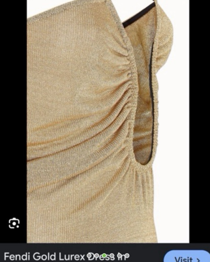 Fendi Gold Metallic Gown. Absolutly stunning dress! Fits like a 4-6. A heavy-ish material so the fabric weighs down on you. I cut out the liner from the hips down because it was bunching up. I am 5’7”. No padding. Perfect Black Tie Gown!!
