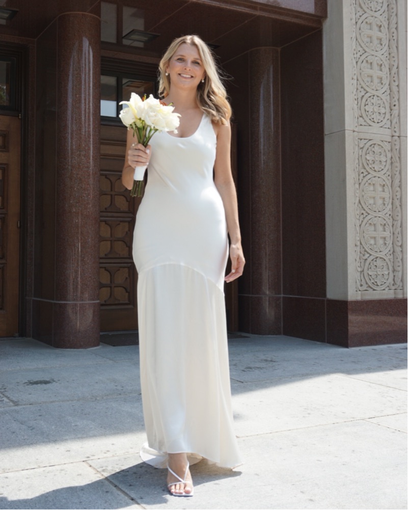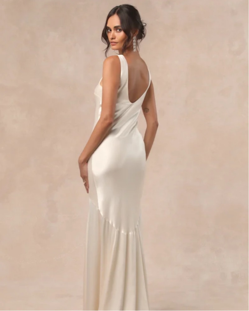 This stunning white satin gown is perfect for a formal event or wedding. The sleek silhouette and floor-length hem create a timeless and sophisticated look. I wore it for a church wedding ceremony and loved it. #wedding #whitedress #rehearsaldress #revolve
