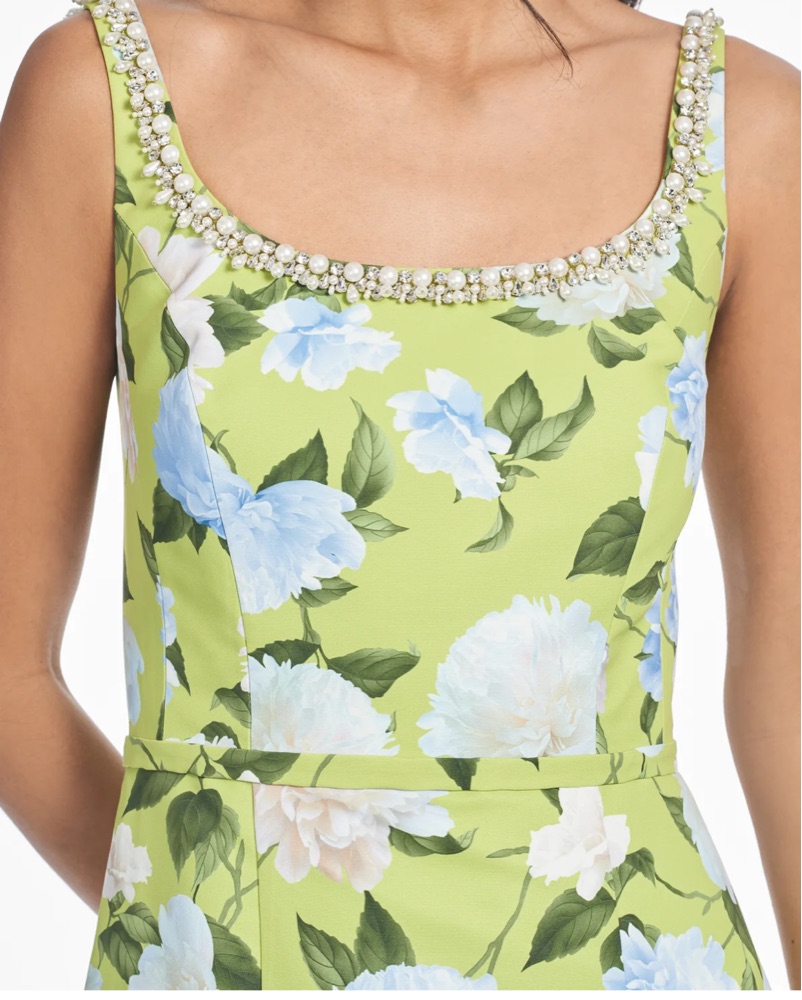 Green floral, formal dress. Beaded neckline. Available in 2 or 4.