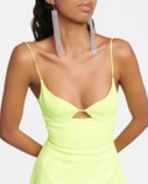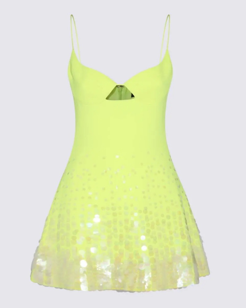 Yellow Gradient Paillettes Cami Mini Dress; invisible zipper in back; cut-out detail; tone-on-tone Paillettes on bottom