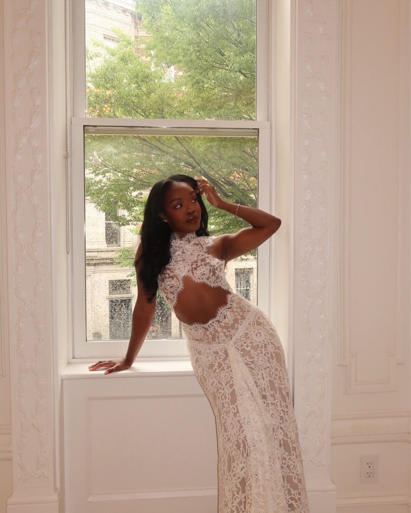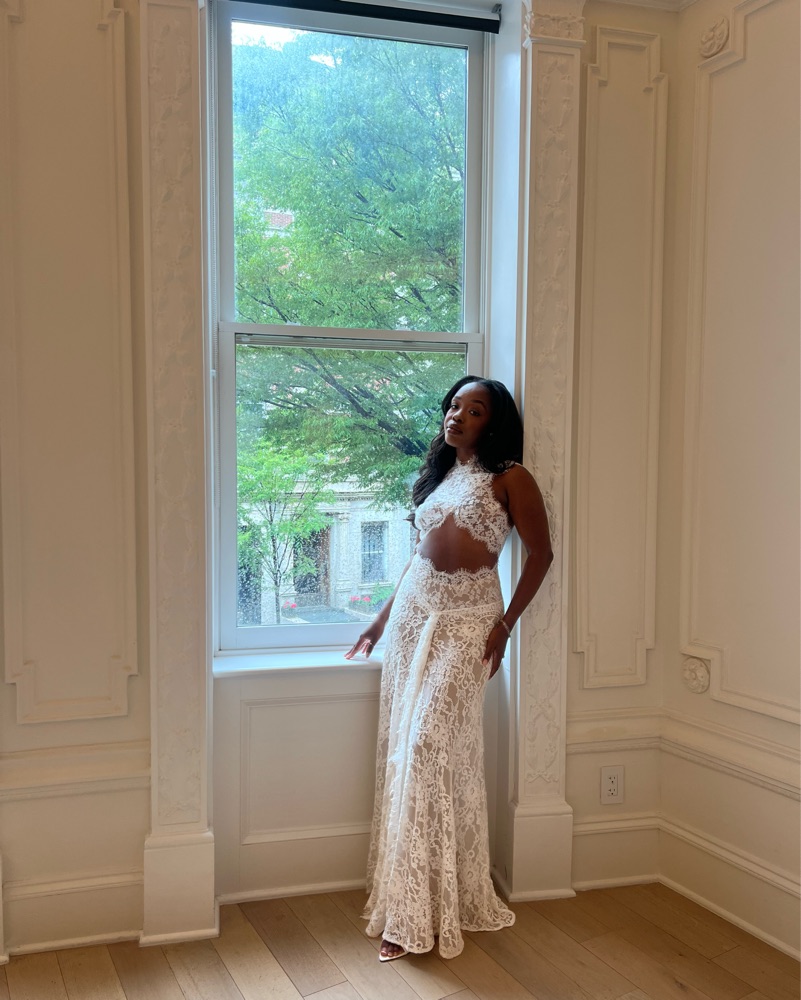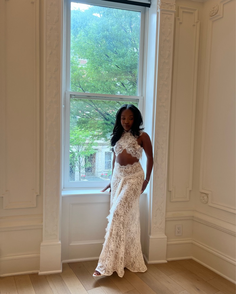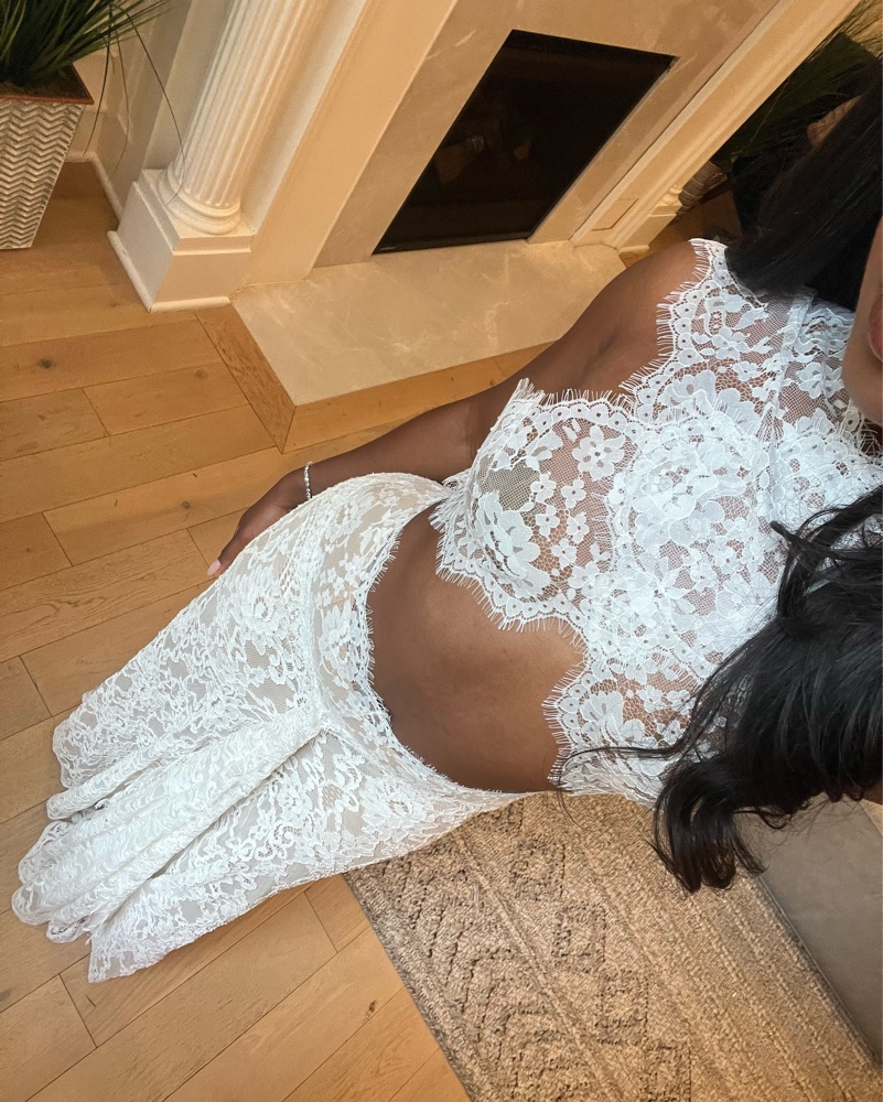 This breathtaking lace gown is perfect for a formal event or special occasion. Originally comes with a train, but I had it tailored/removed so it’s more wearable for a night out. Comes with a nude skirt slip. Perfect for your bridal era!