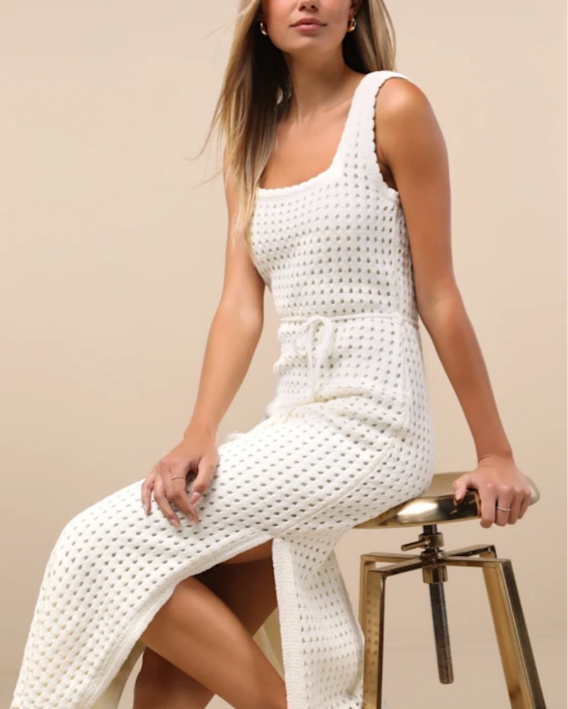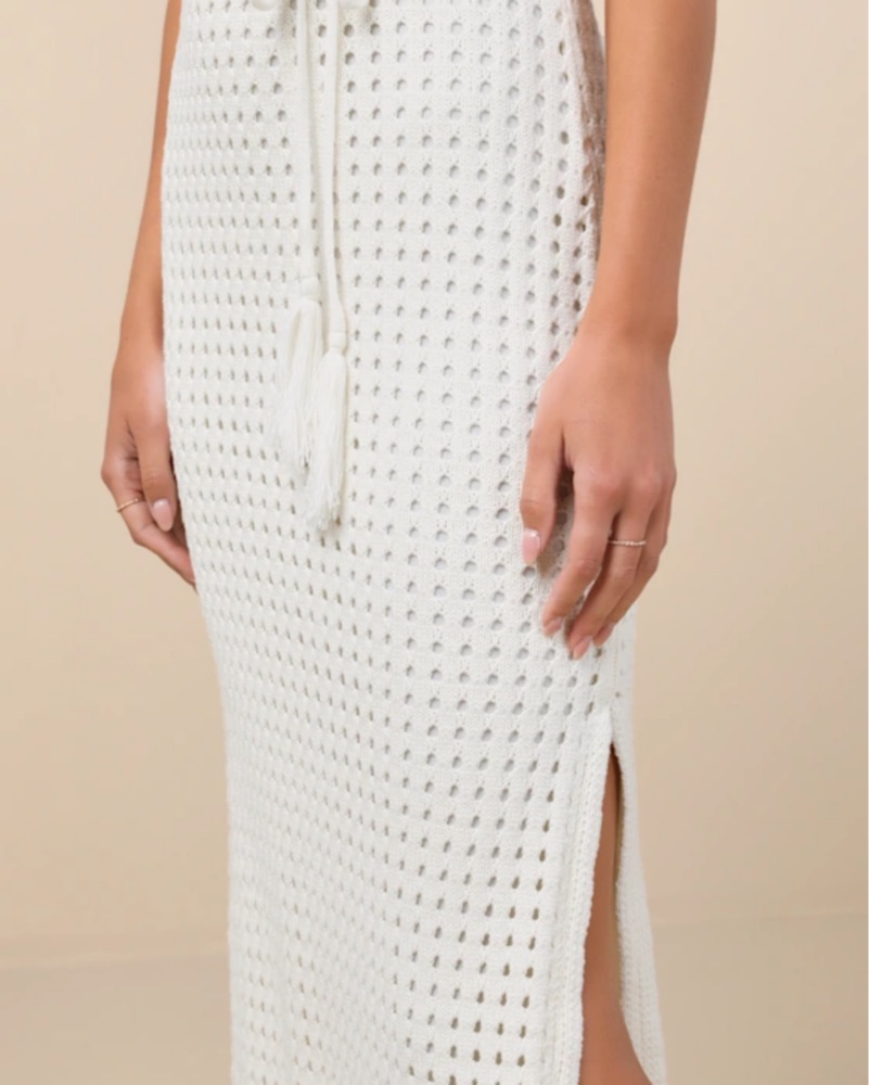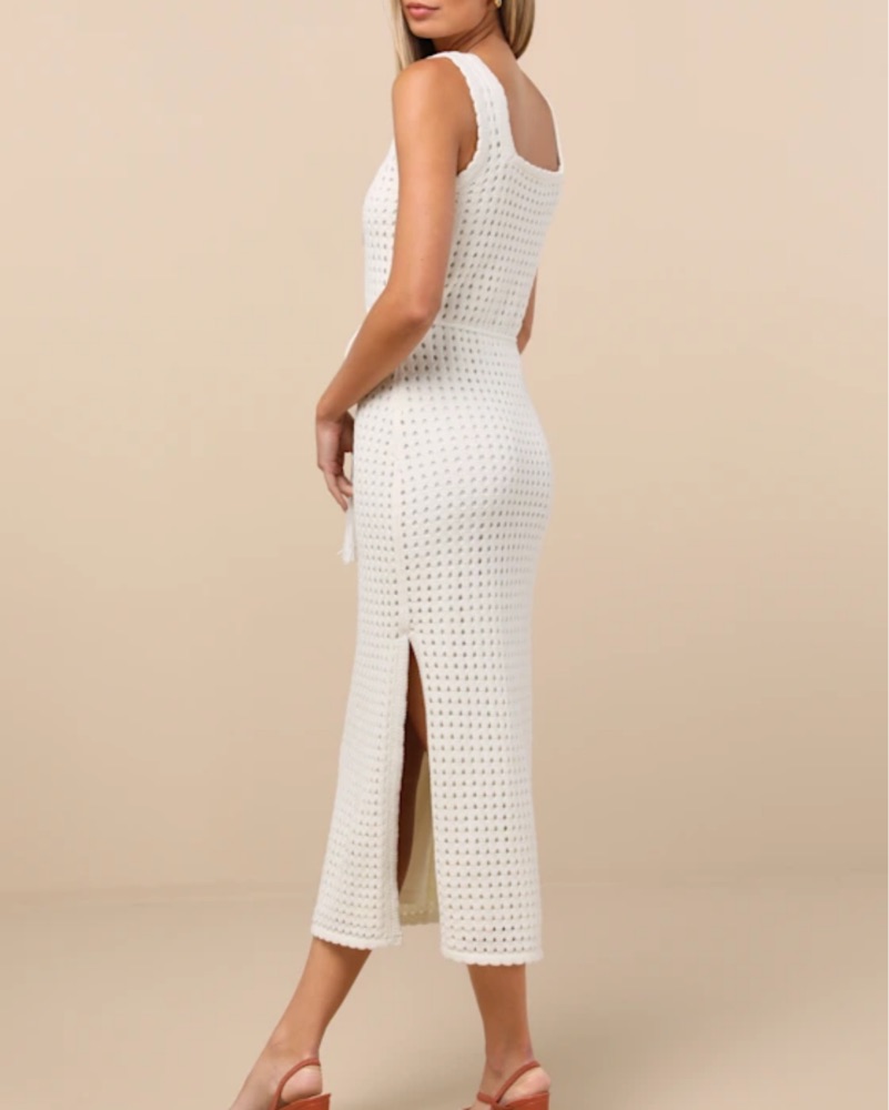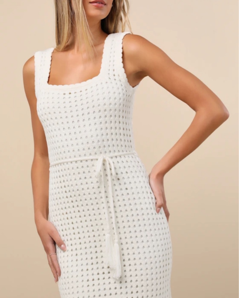 Never worn! Ivory Crochet dress with wide straps that support a cute square neckline. A fringe-adorned tying belt cinches at the waist of the figure-skimming silhouette as it falls to a chic midi hem. Scalloped trim accents throughout. Perfect for beach bachelorette or honeymoon!