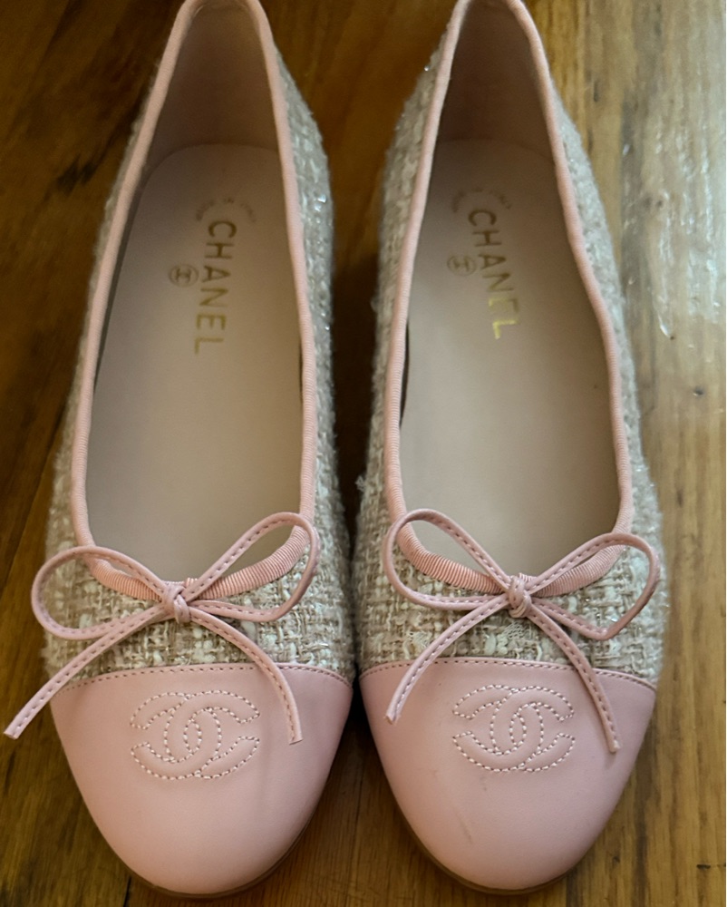 These stylish Chanel flats in a soft pink and beige are perfect for a chic day-to-night look. The delicate bow detail adds a feminine touch.