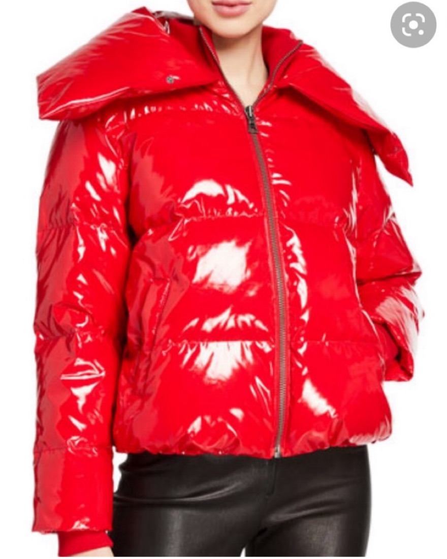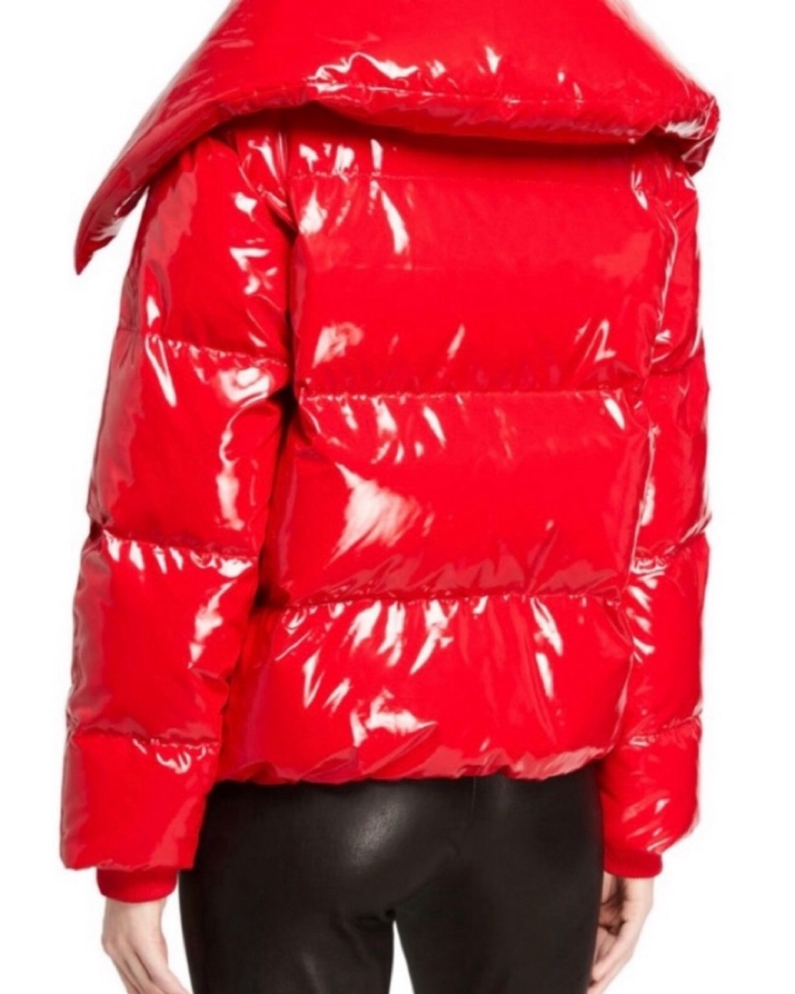 Love the oversized collar and shiny red finish of this puffer jacket! Comfy and warm.
