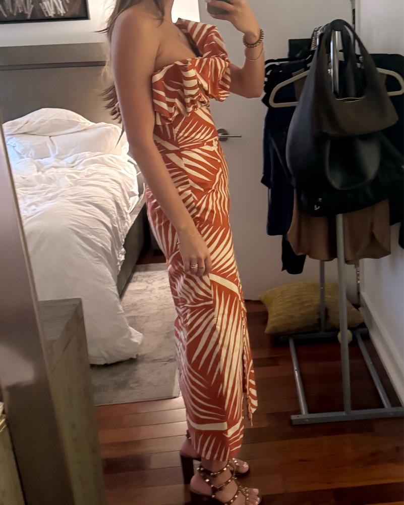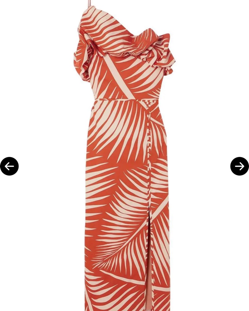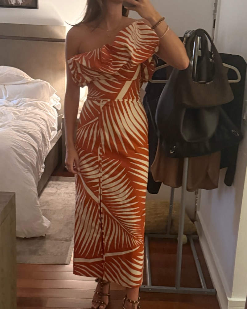 Orange midi one shoulder dress with ruffled front detail by Johanna Ortiz. Not stretchy. Dry clean included in price.