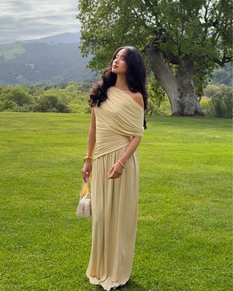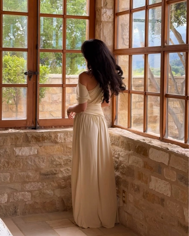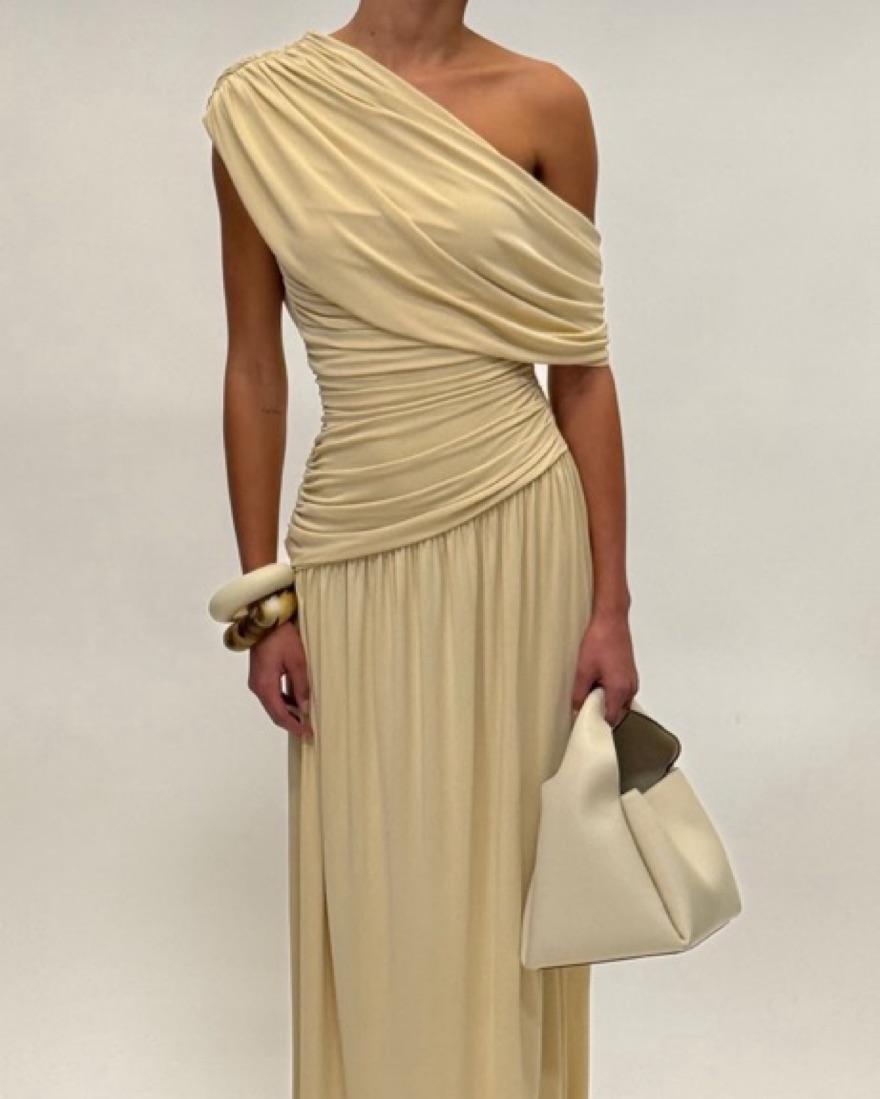 apolla jersey dress in dune yellow color. off shoulder design. perf bridesmaid dress!!! True to size. Open to selling