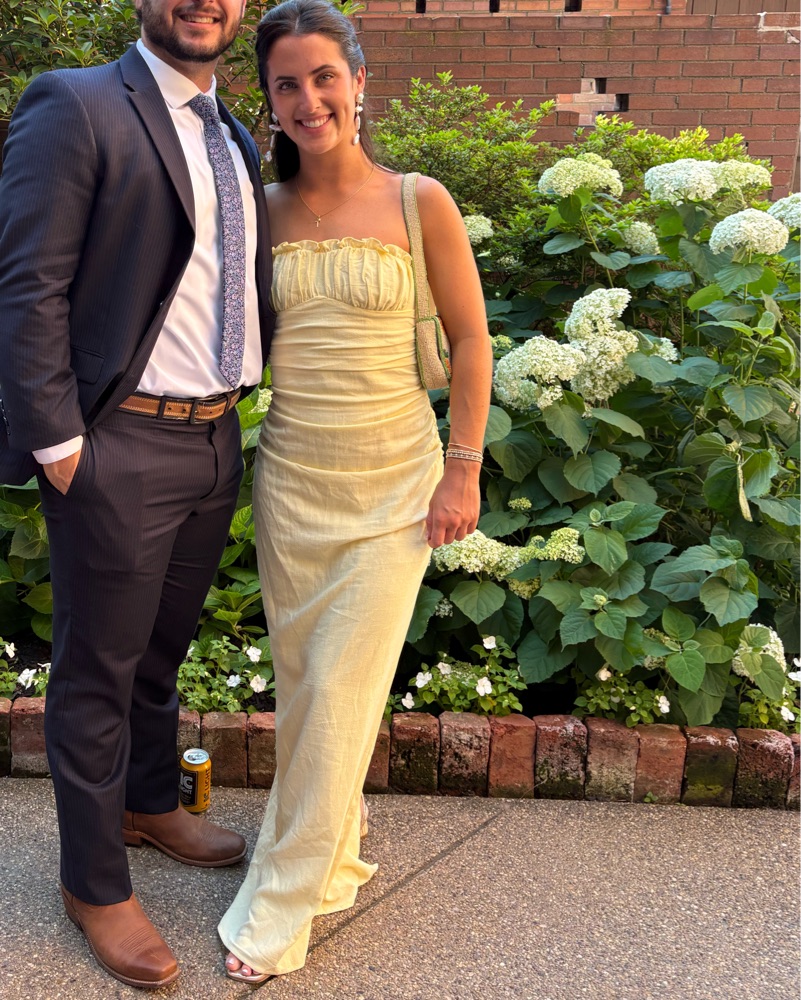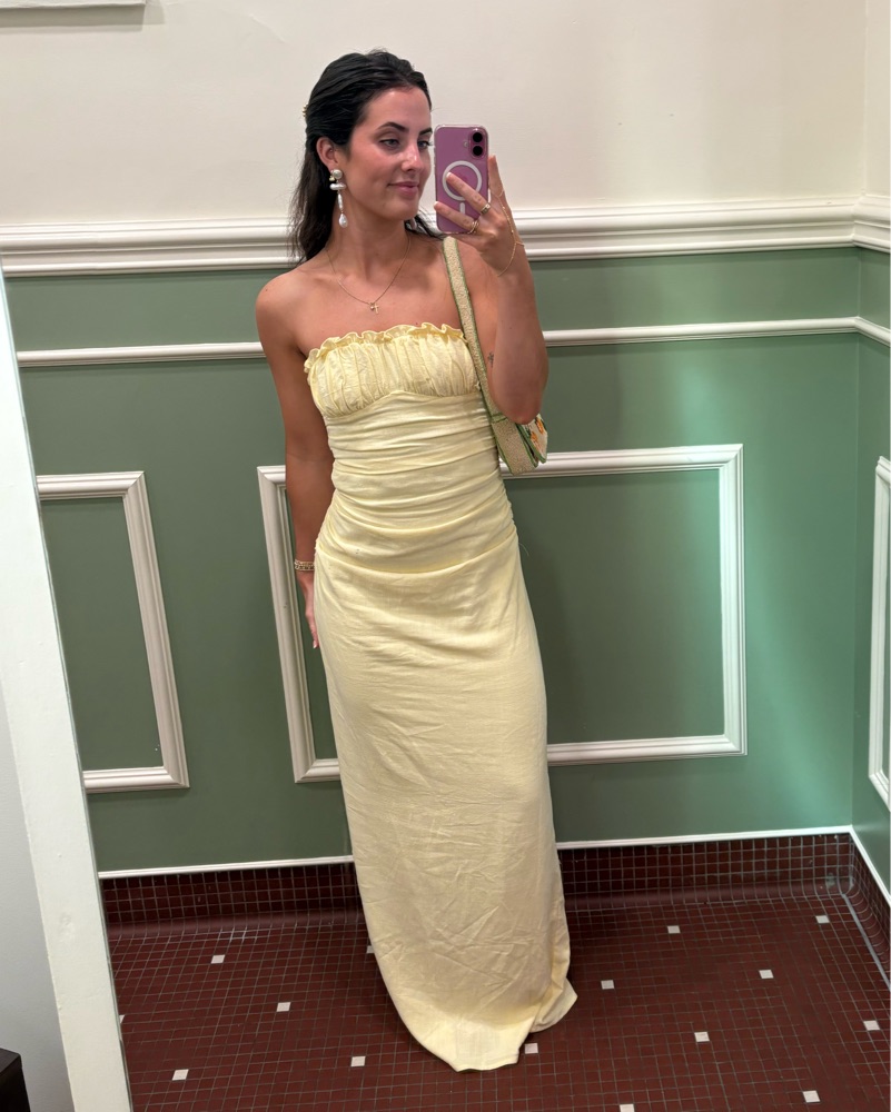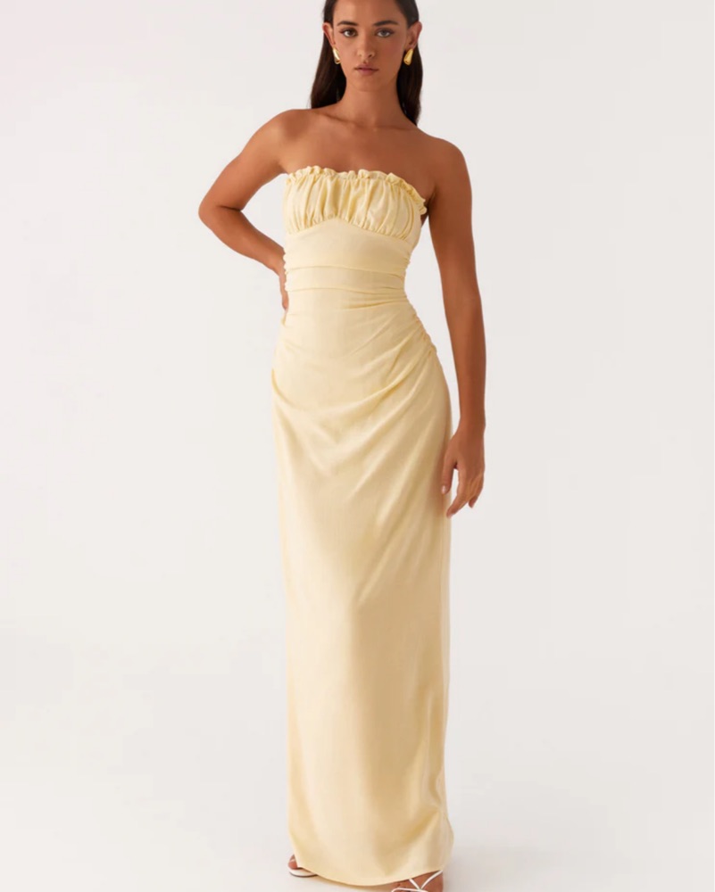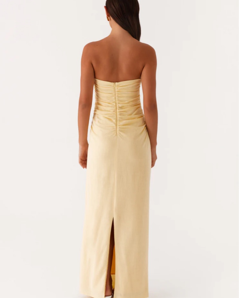 This stunning strapless yellow gown is perfect for a formal event or special occasion. The ruched bodice and flowing silhouette create a flattering and elegant look.