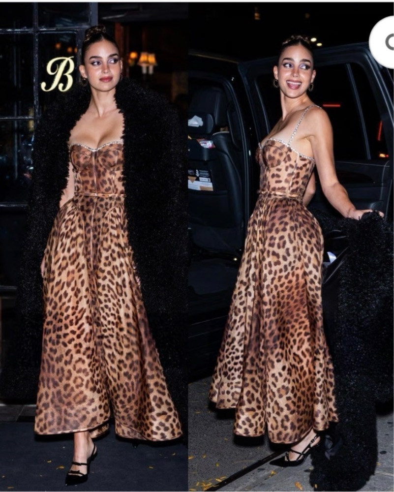 The Crush Panelled Midi Dress in Leopard from the Resort ‘25 Collection, Crush. A silk-linen midi dress featuring a sweetheart neckline with crystal trims around the top edge and on the straps; finished with corset detailing, a shirred back, and a full flared skirt. Designer size 1, fits a US 4/6.