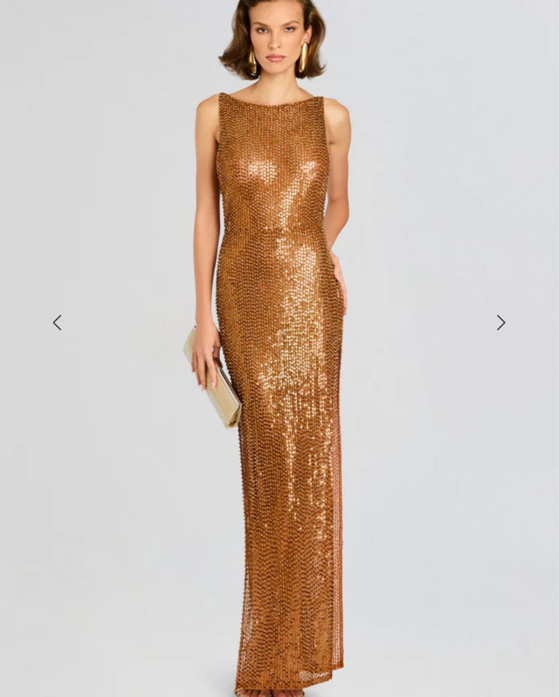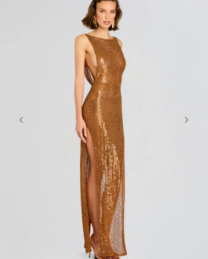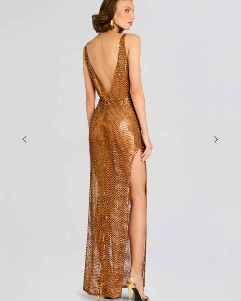 This stunning gold sequin gown is a show-stopping choice for your next formal event. The figure-flattering silhouette and thigh-high slit make it a red carpet-worthy look.