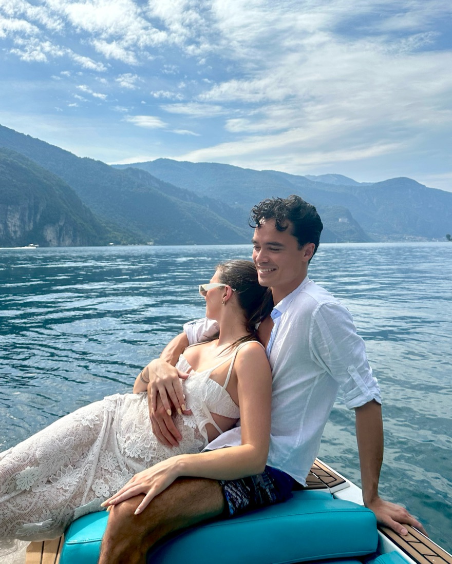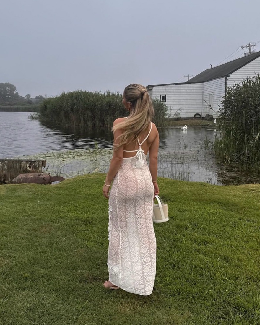 White cover up with stunning lace/flowering detail. Sheer but surprisingly decent coverage given the flower detailing. Completely adjustable tie closure