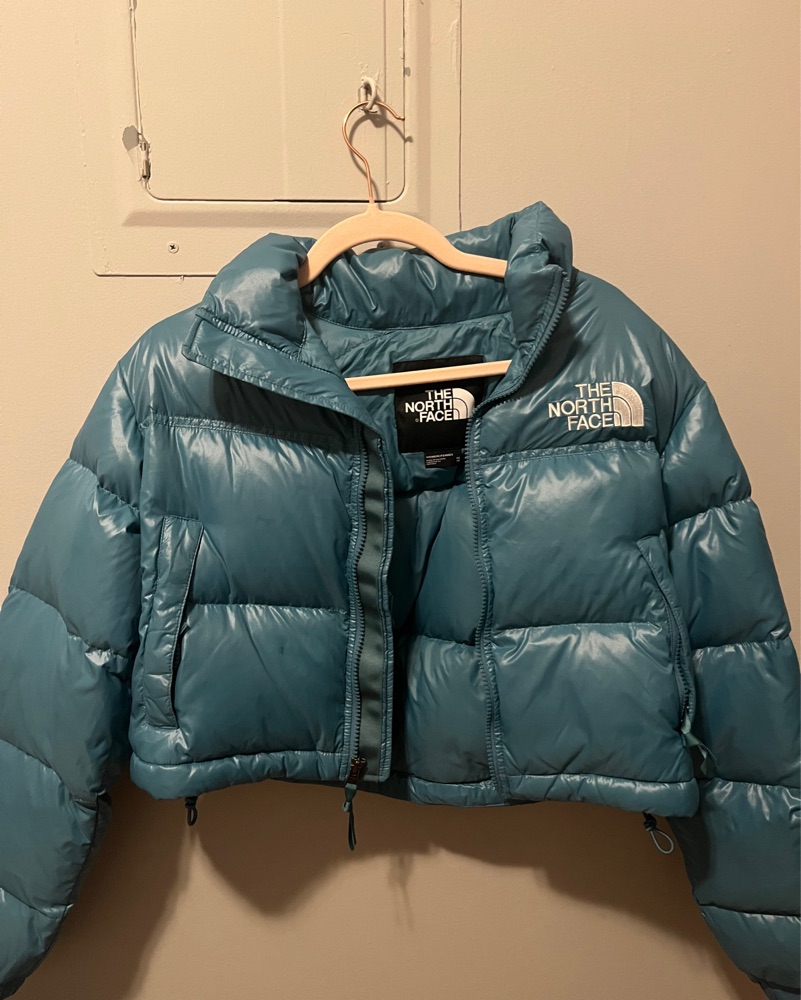 Stay warm and stylish in this high-quality puffer jacket from The North Face. Perfect for cold weather adventures or casual wear. It’s a beautiful shade of teal blue