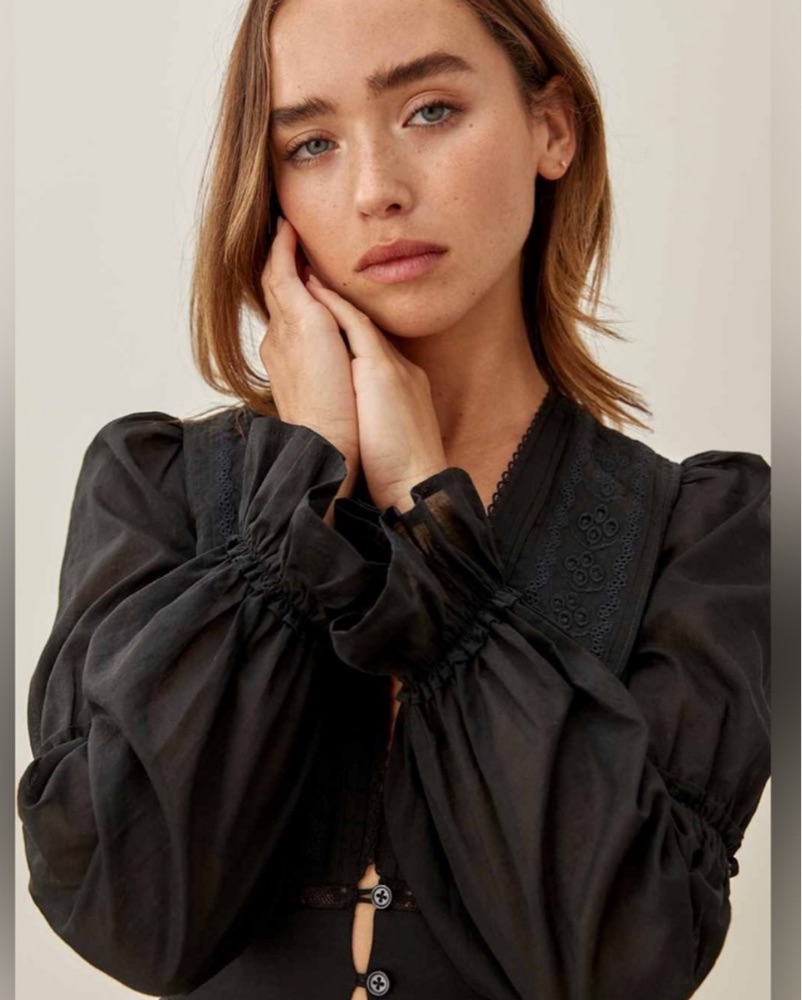 This chic black peplum blouse with intricate lace detailing adds a touch of sophistication to any outfit. Perfect for a night out or a special occasion.