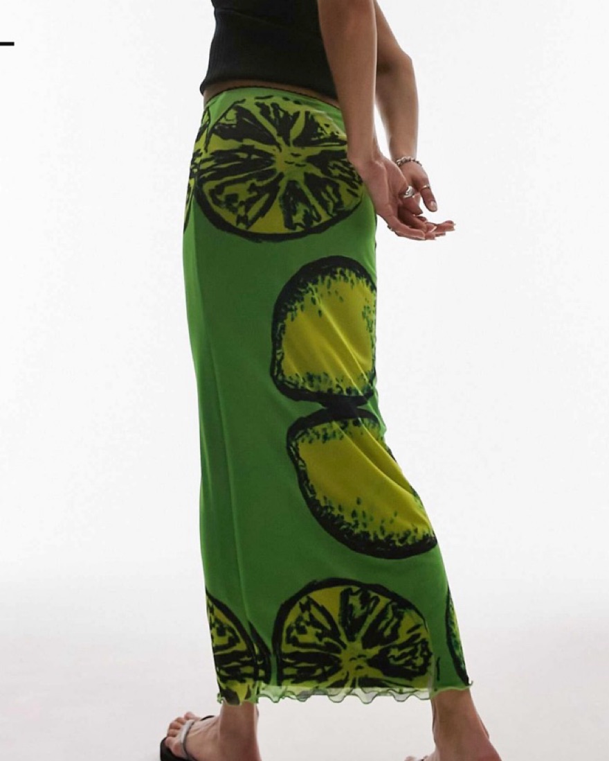 Unique green mesh midi skirt with lemon lime print. Perfect brand new condition. Vibrant, colorful skirt for summer, vacation, resort etc.