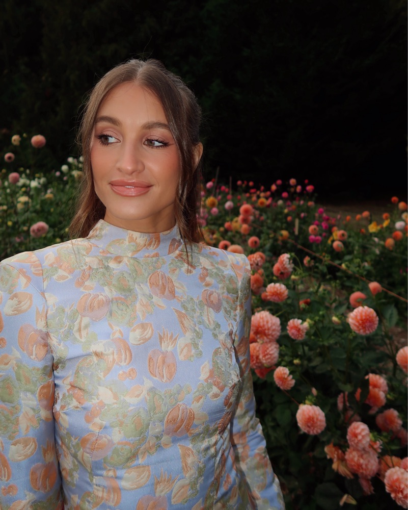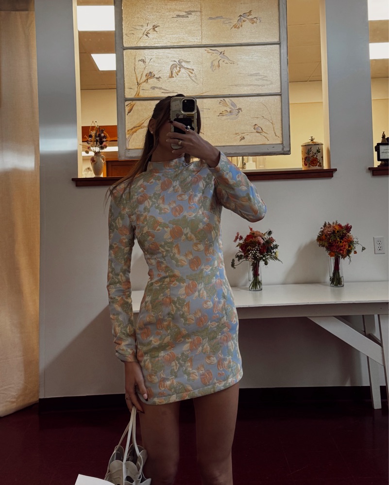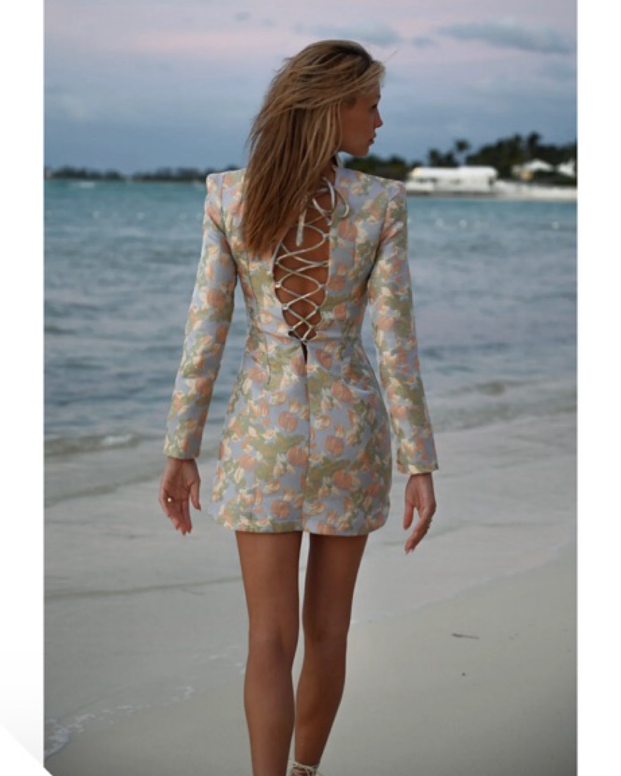 Elegant floral mini dress. Perfectly structured with shoulder pads with a lace up back and zipper on the side